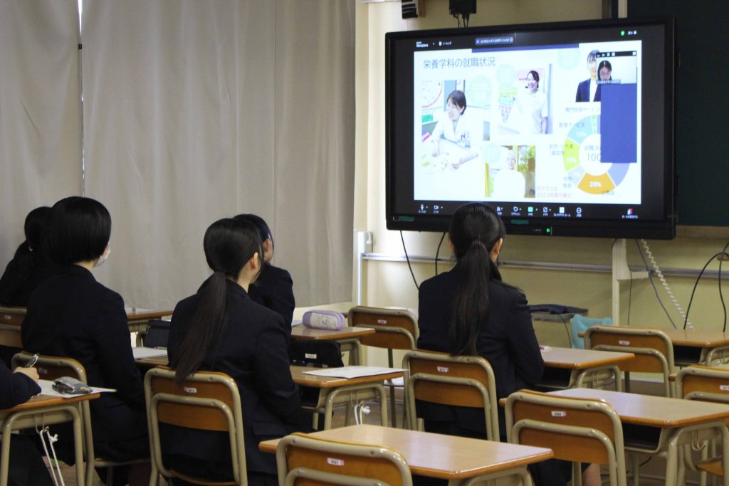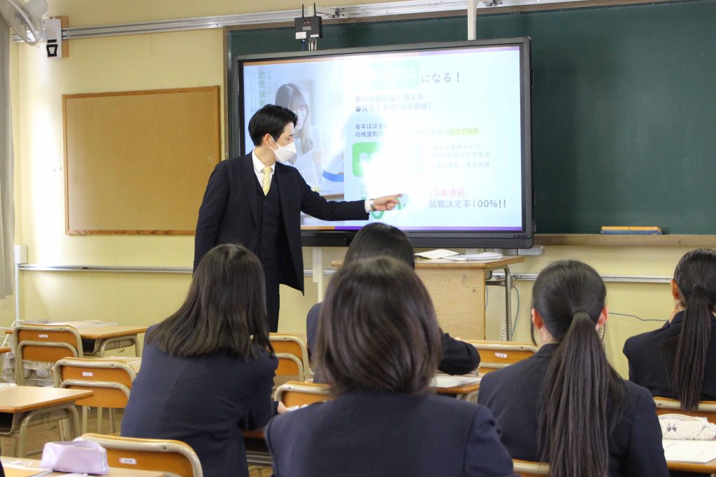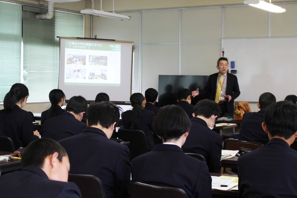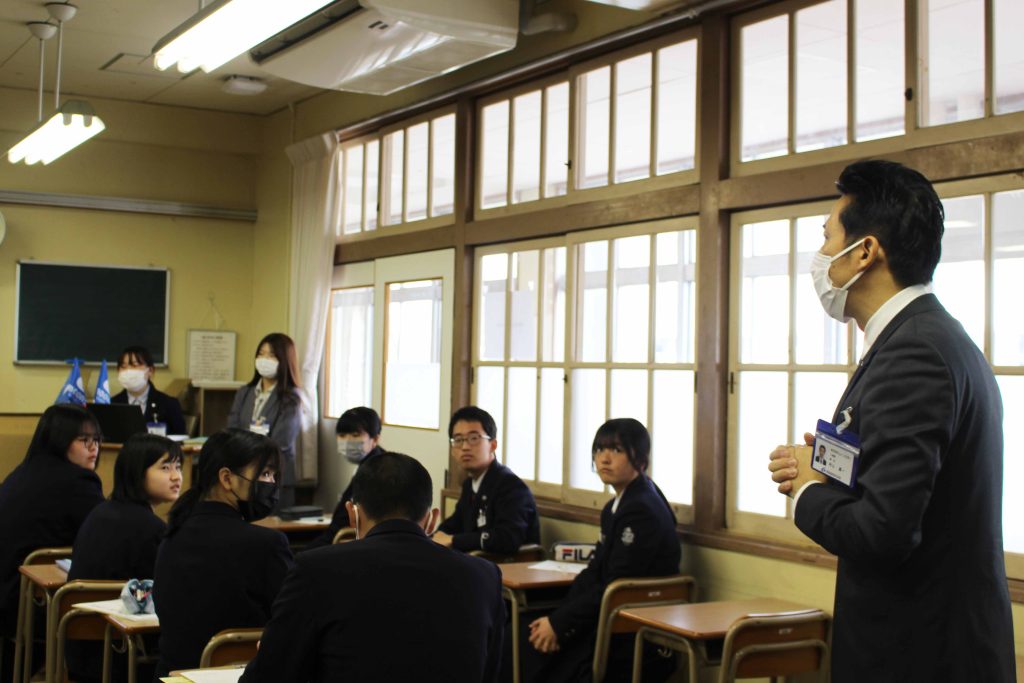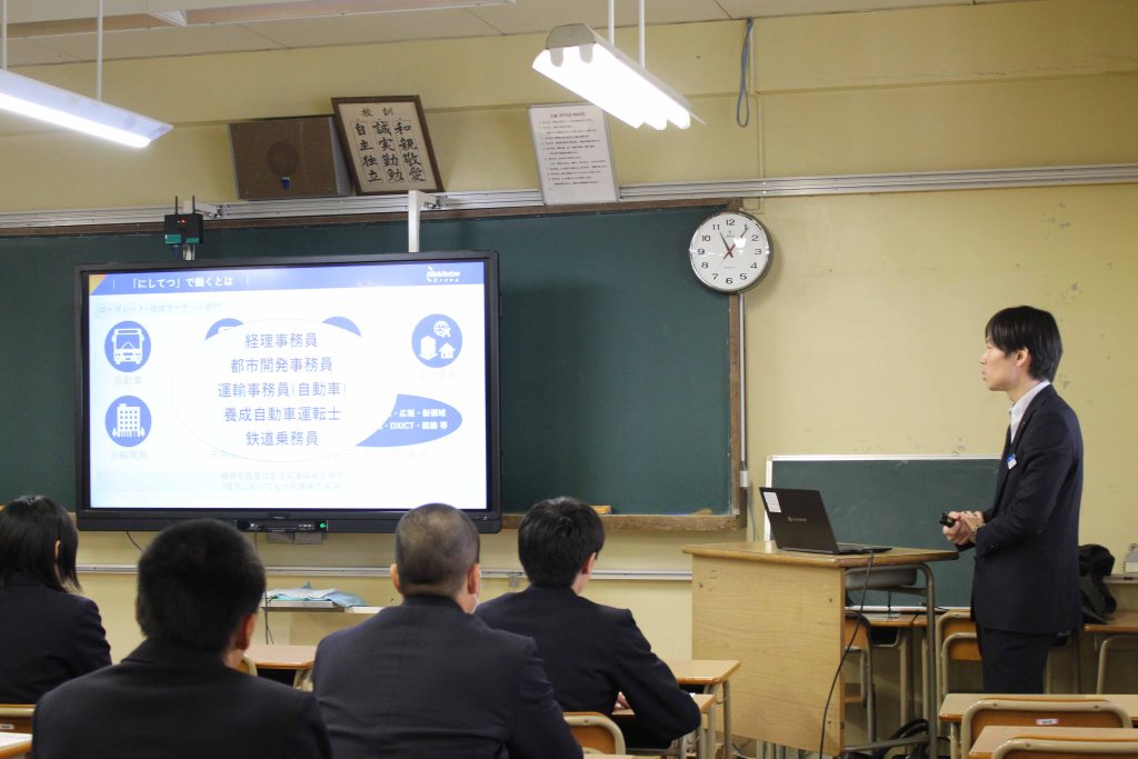 3月14日(金)、久商キャリアセミナーを本校で実施しました。最初に1年生は進路講演会、2年生は中経協の方々の出前授業を受け、その後、進学希望者は大学の説明会、就職希望者は企業説明会に参加し、公務員希望者は就職した先輩からのメッセージビデオの視聴や公務員模試などを受けました。