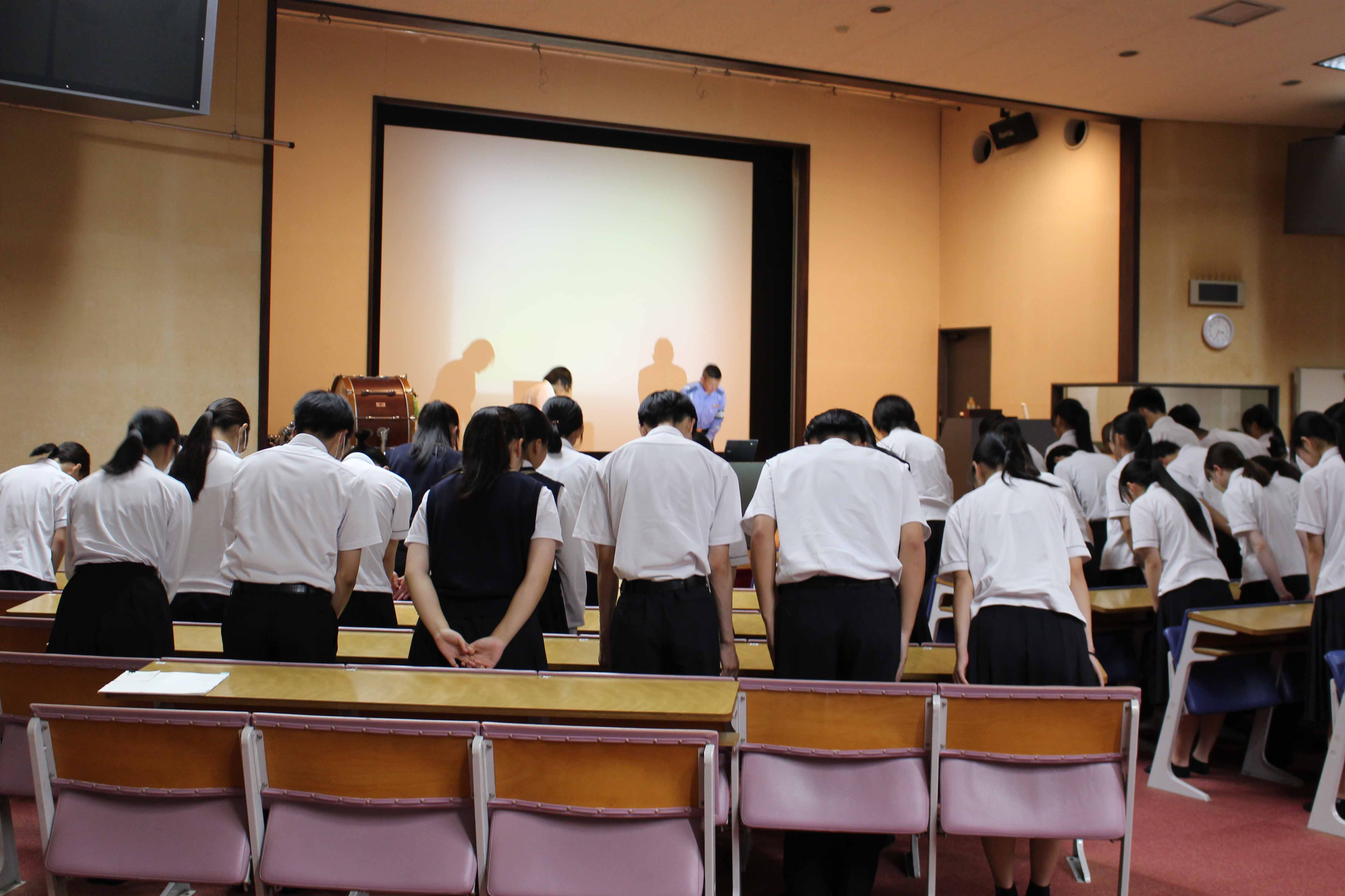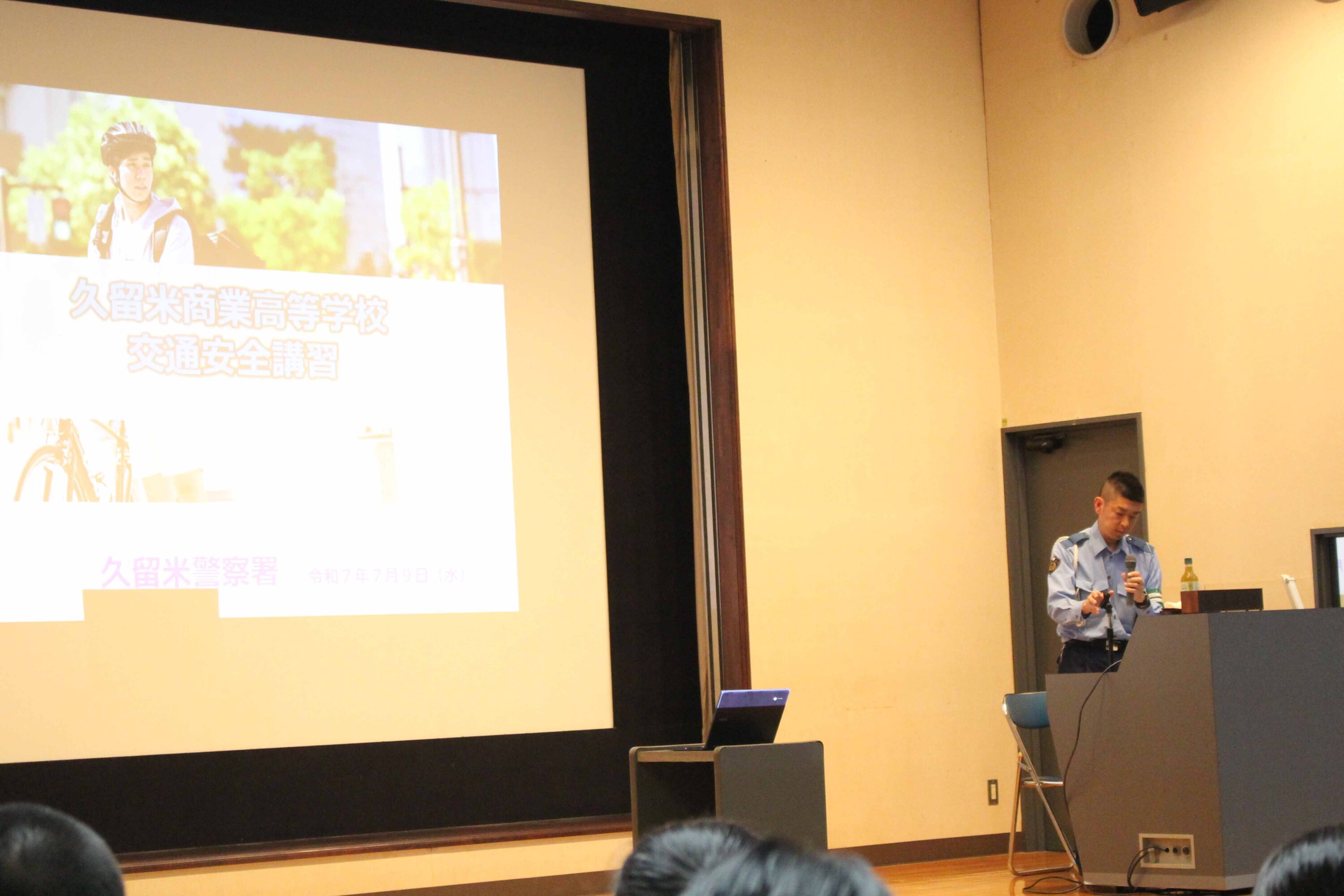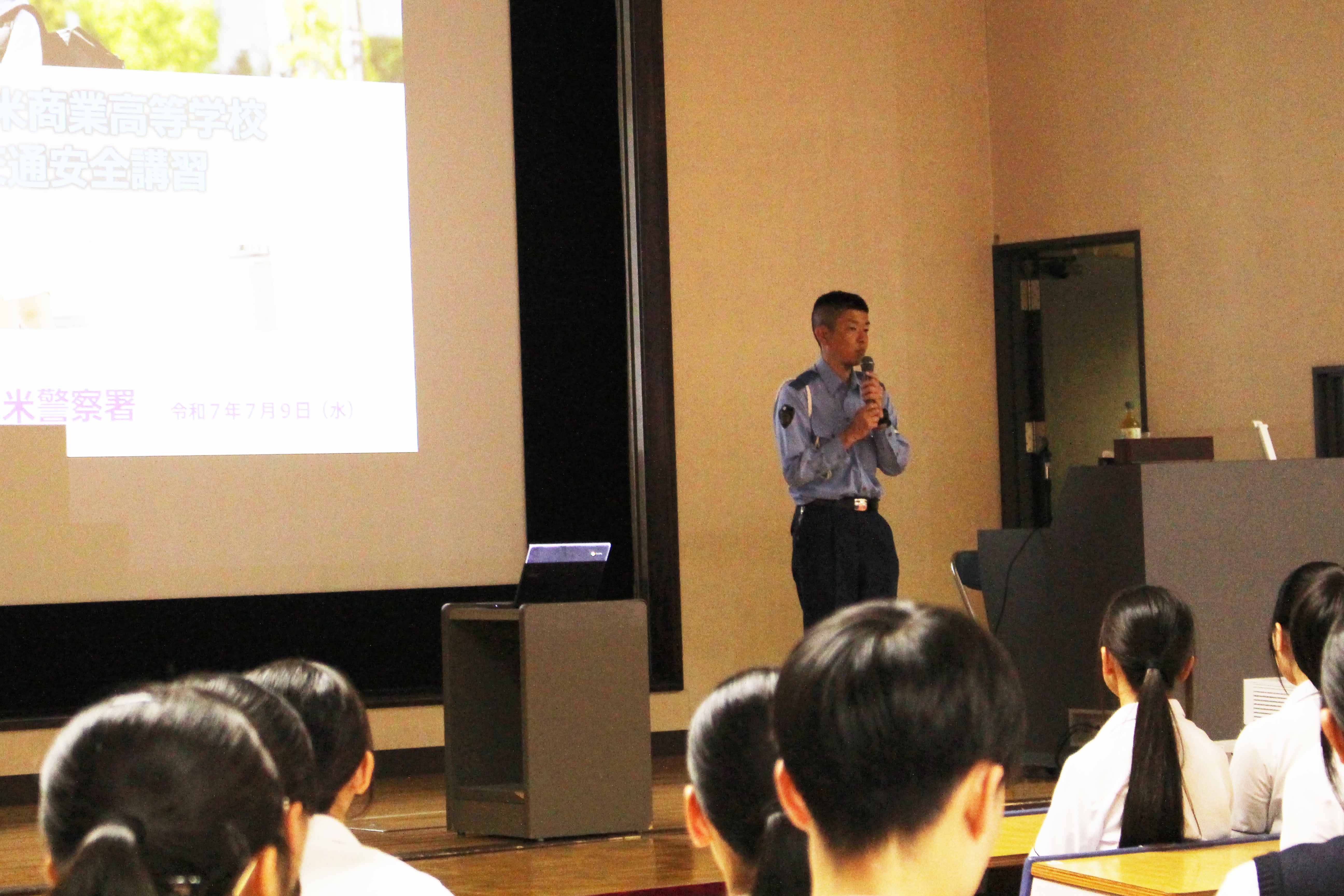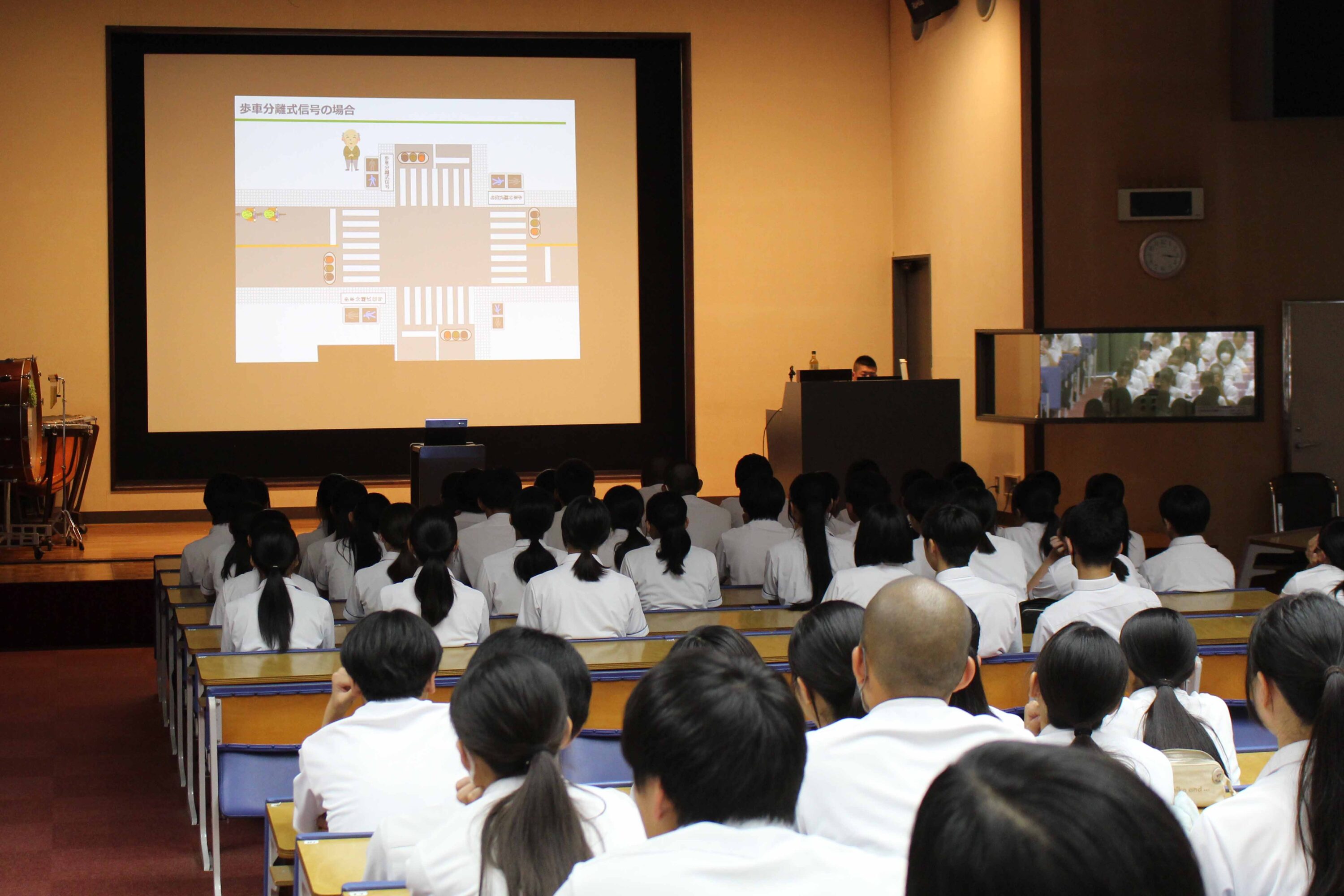 7月9日(水)、交通安全教室が行われました。今回は久留米警察署の方に来校していただき、1年生はレクチャーホールで、2,3年生は教室でのオンライン配信で講話をきき高校生の身近な問題である自転車事故、特に加害者事故をテーマによくある事故のパターン、運転ルール・マナー、加害事故で問われる責任や備えとしての損害保険などについて学び、安全意識を高めました。