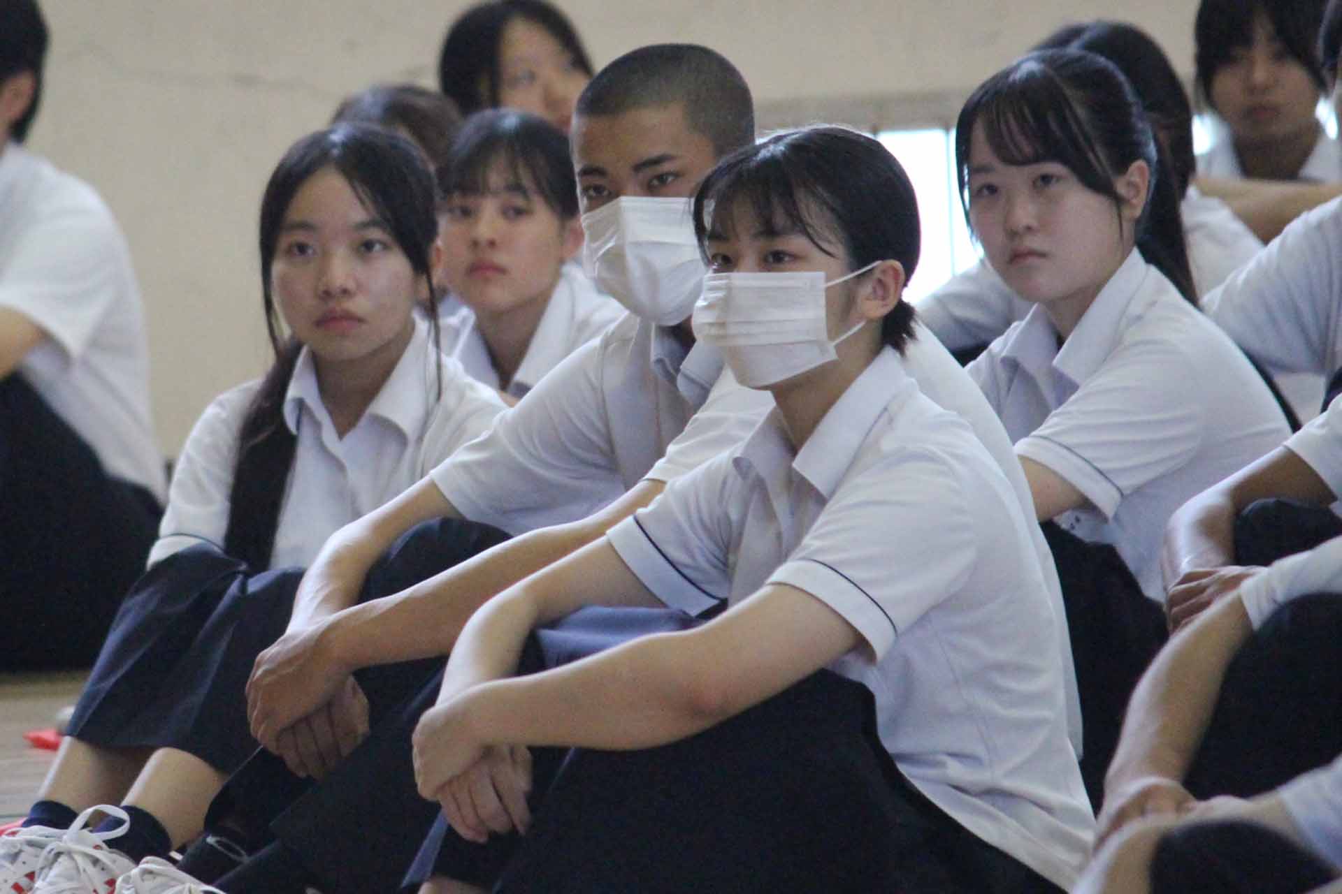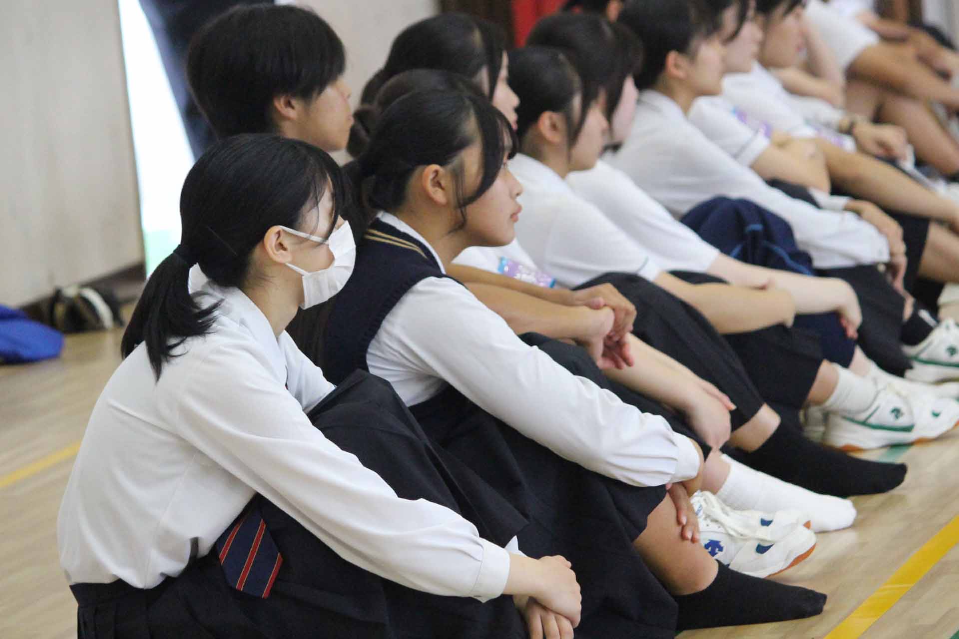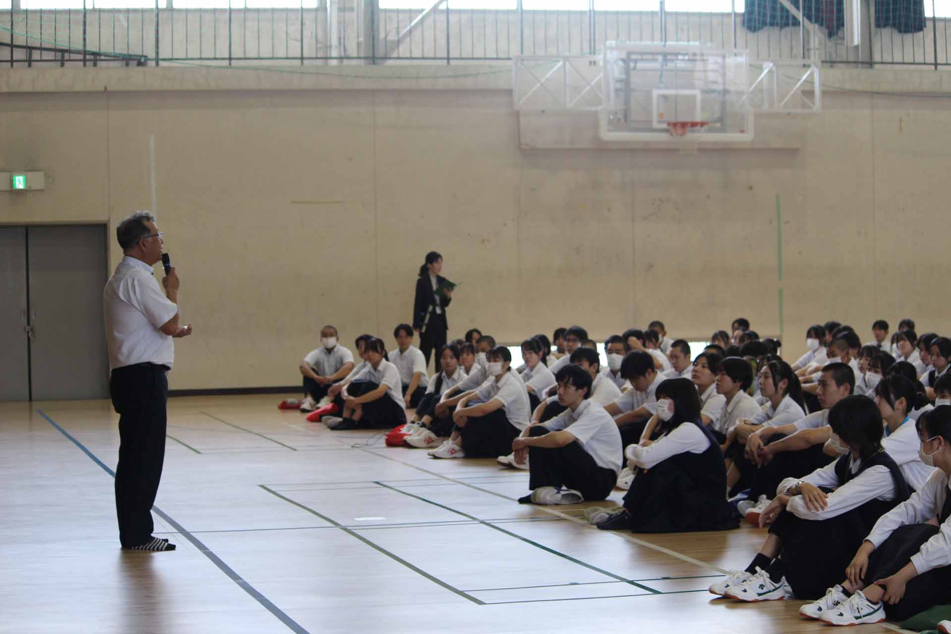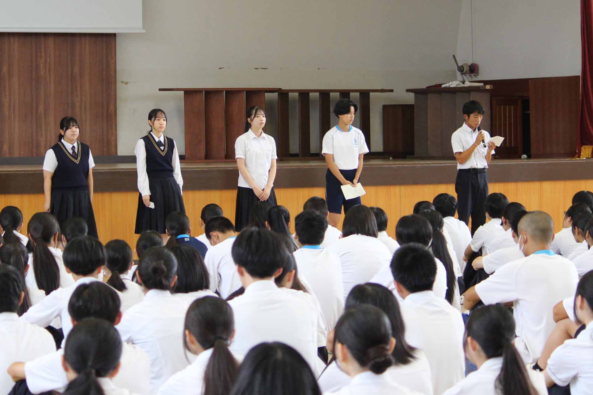 9月18日(木)、体育館で全校朝礼がありました。今月は教頭先生からのお話があり、次にソフトテニス部、珠算・電卓部、情報処理部、簿記研究部からの部活報告、風紀委員会から駐輪場の現状報告と制服のルールについて話がありました。