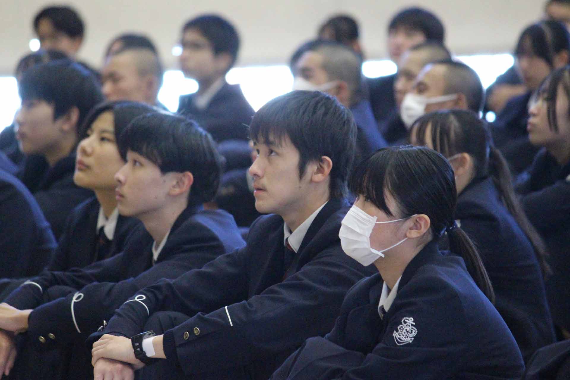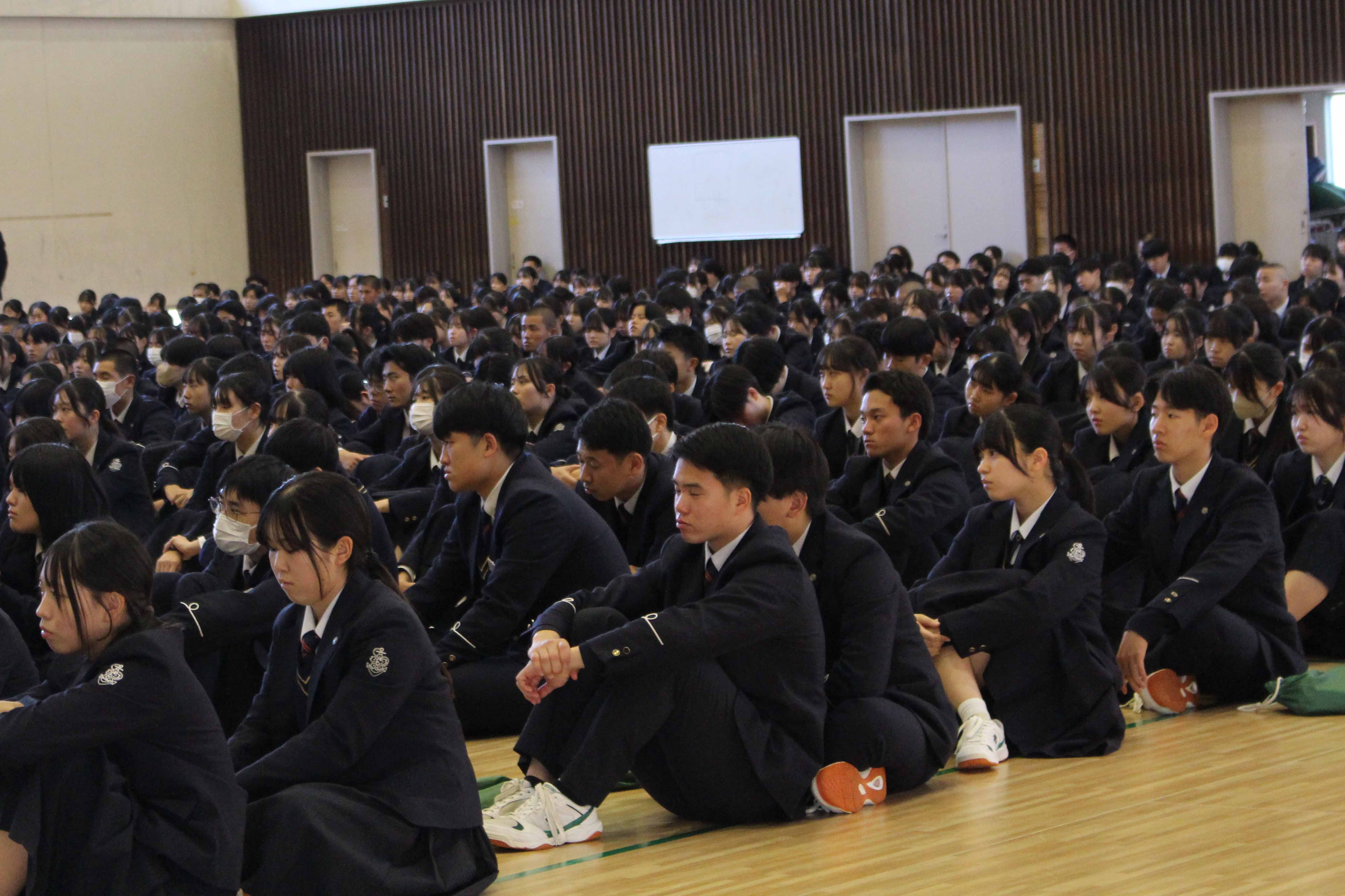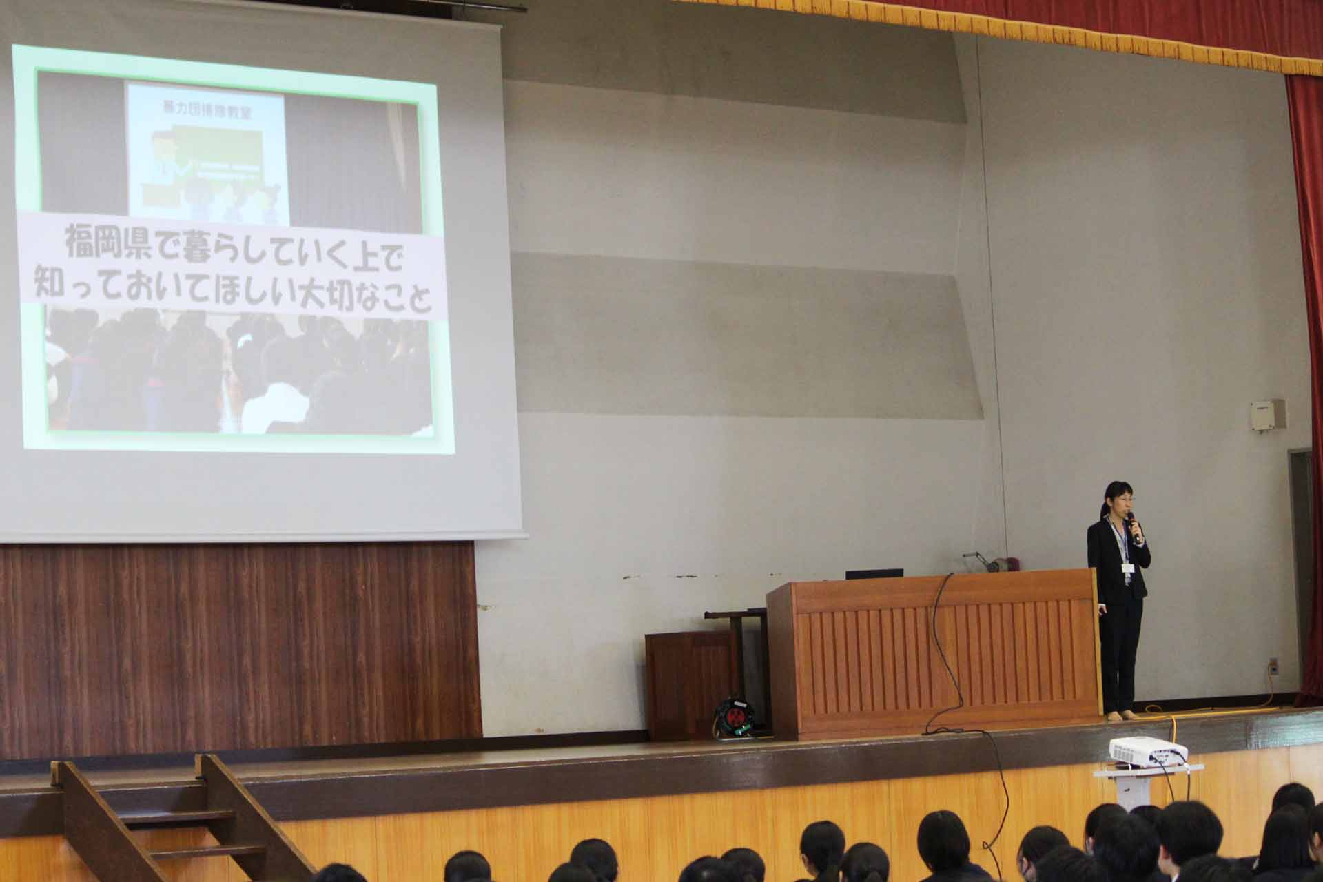 10月29日(水)、本校体育館で暴力団排除教育・薬物乱用防止教育がおこなわれました。福岡県警察本部 組織犯罪対策課の方に来ていただき、暴力団排除の重要性や暴力団員による犯罪(薬物乱用も含めて)に巻き込まれないためにはどう行動すればよいかなどについて講話していただきました。最後に全校生徒を代表して、厚生委員長の中垣如葉さん(3年・浮羽中)が「これまで、暴力団による犯罪とか自分には関係ないと勝手に思っていたが、今日の講話を聴いて、犯罪が巧妙で複雑化していて、SNSを使ったものが多いと知り、身近なところで起こっていることなんだと改めて感じました。今日の講話を参考に、自分や周りの人たちを守る行動をしていこうと思います。今日はありがとうございました。」と謝辞を述べました。