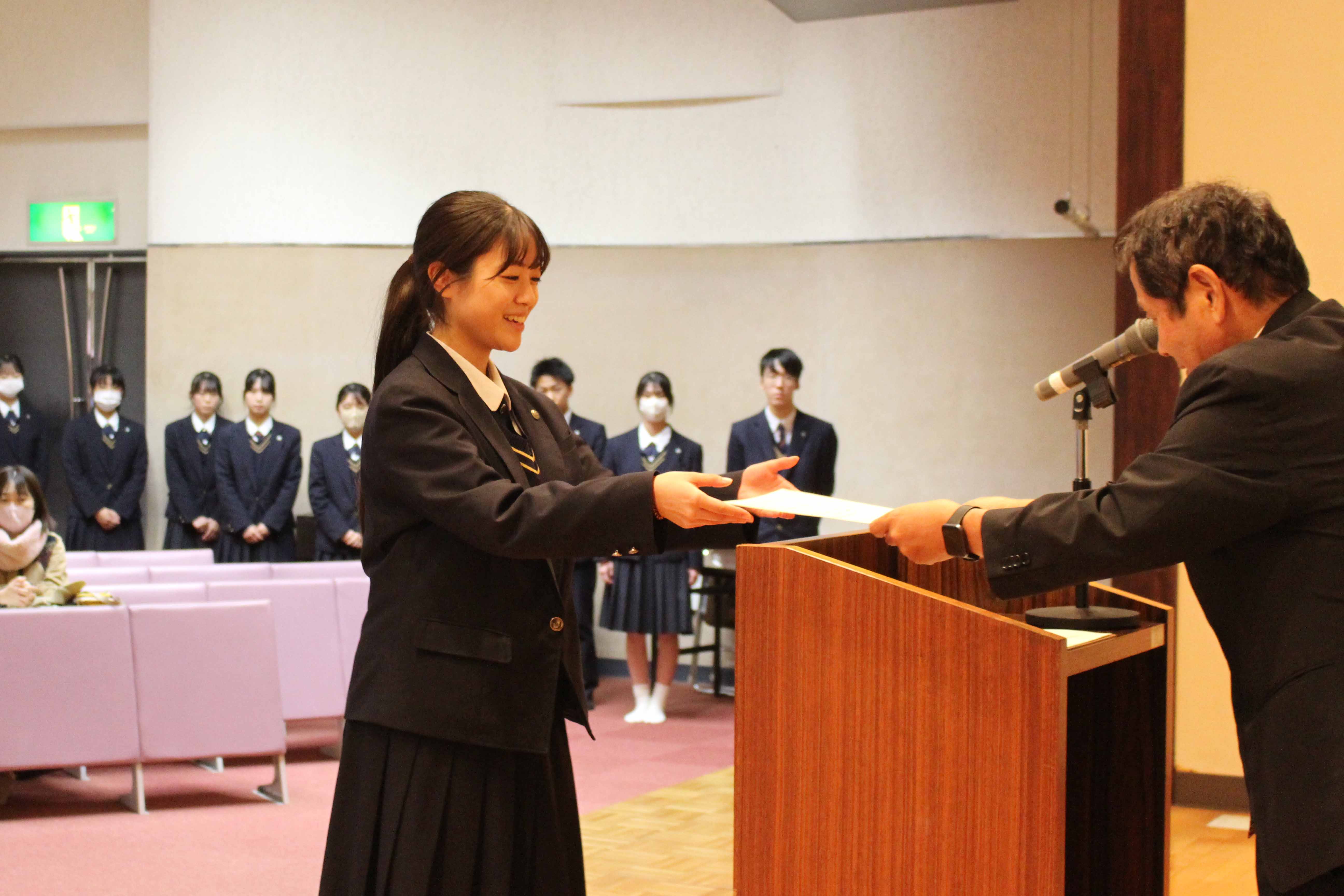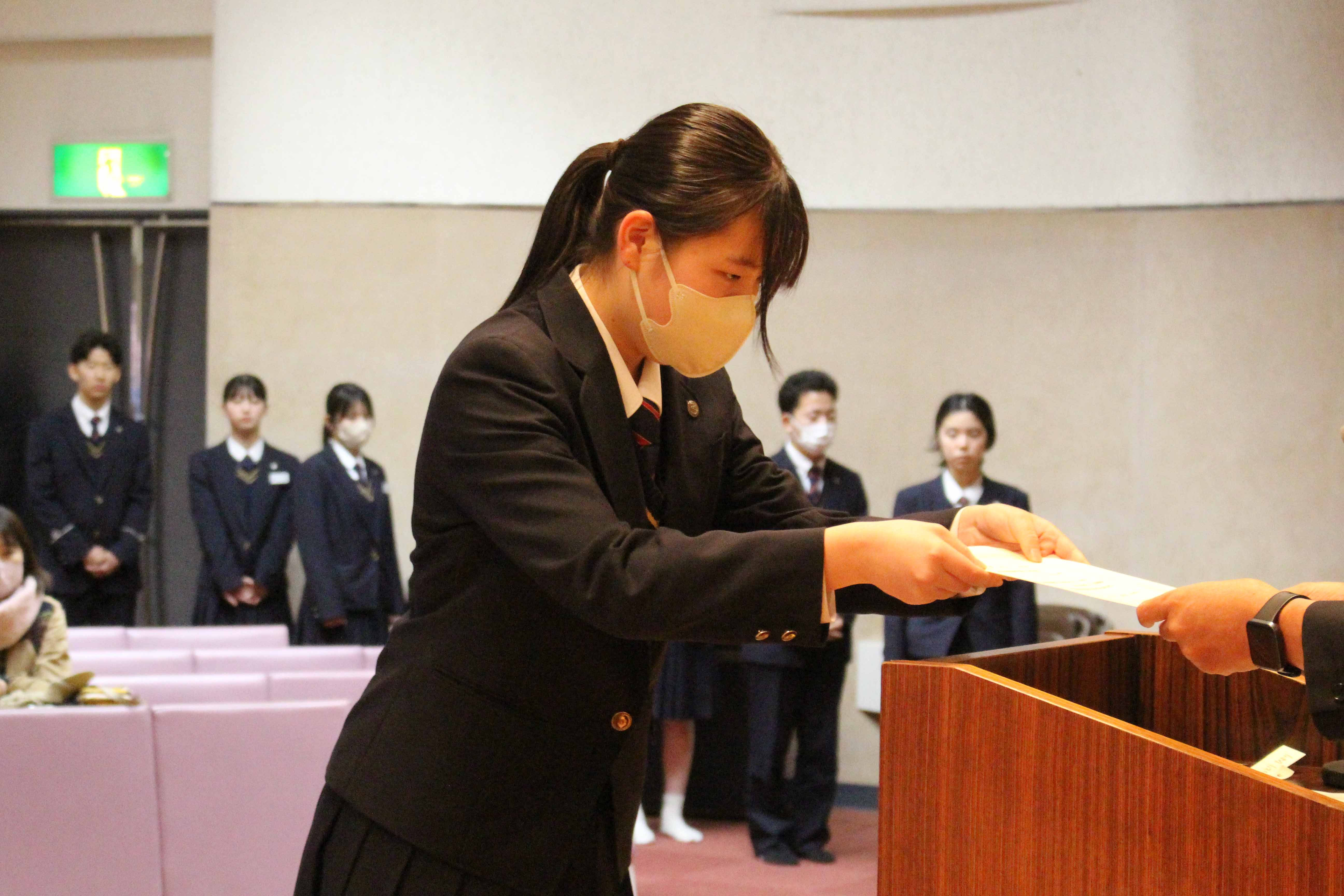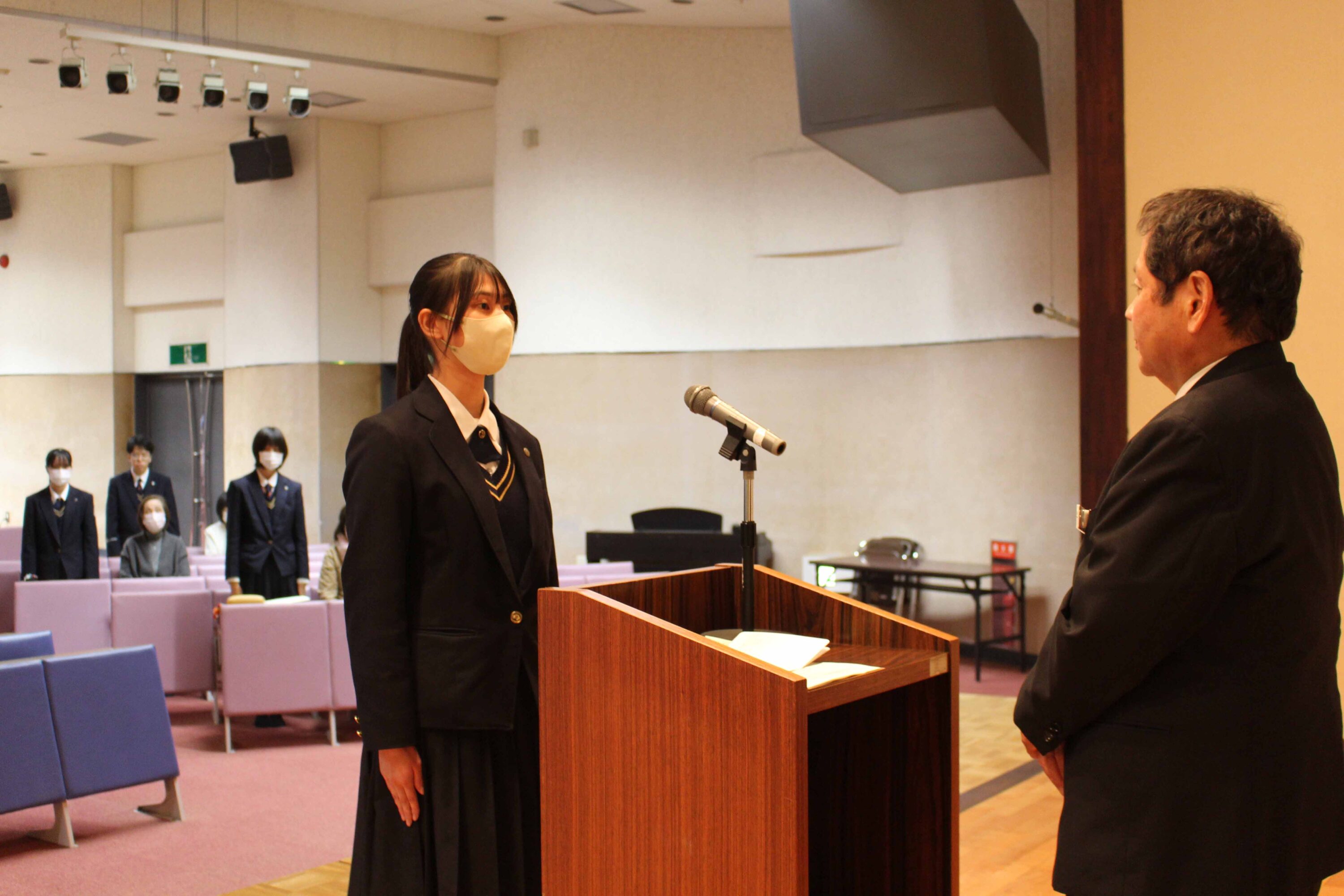 11月12日(水)、本校レクチャーホールで指定校伝達式が行われました。保護者や職員が見守る中、受験を許可された生徒へ校長から承諾書を授与されました。学校長あいさつの後、生徒を代表して酒井 心春さん(牟田山中出身)が宣誓を行いました。