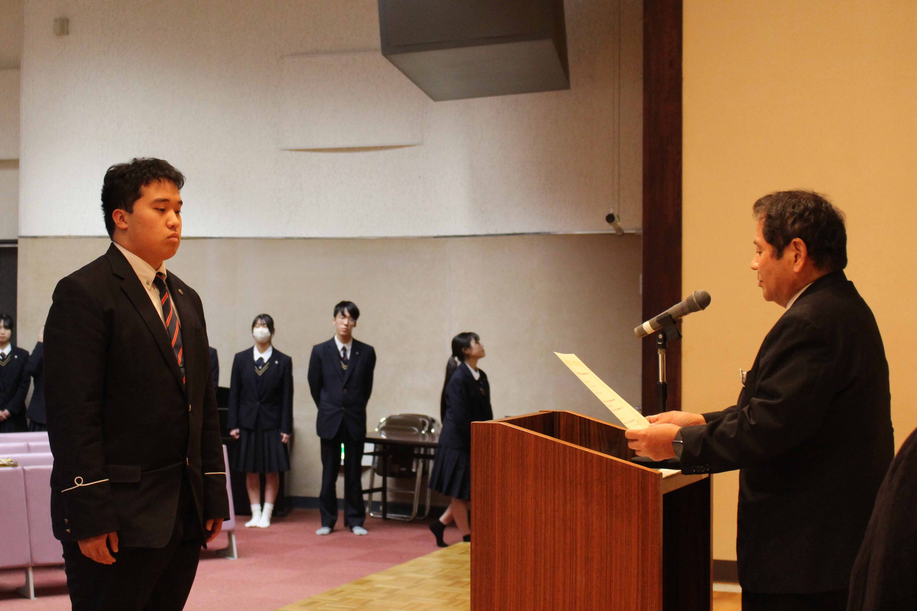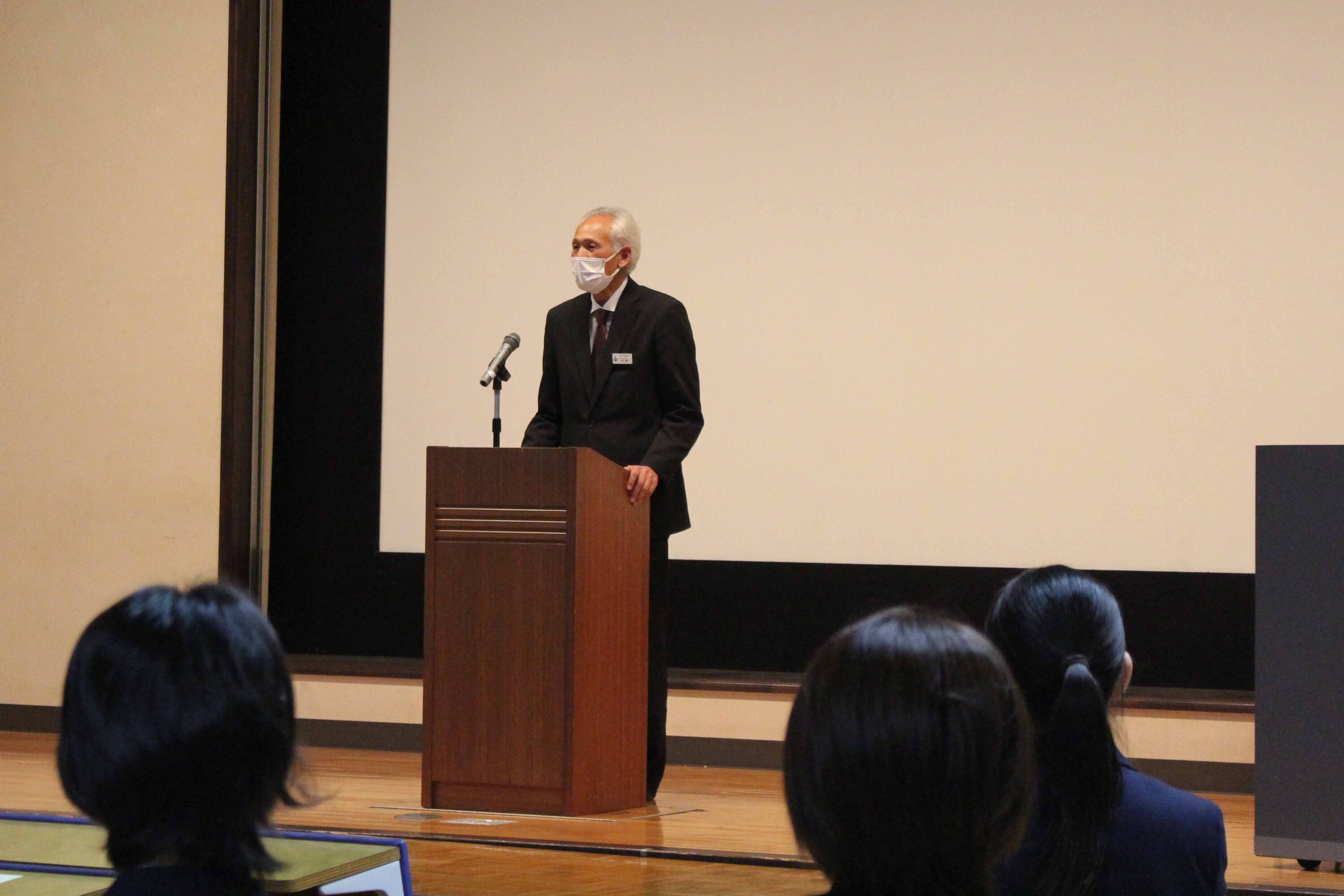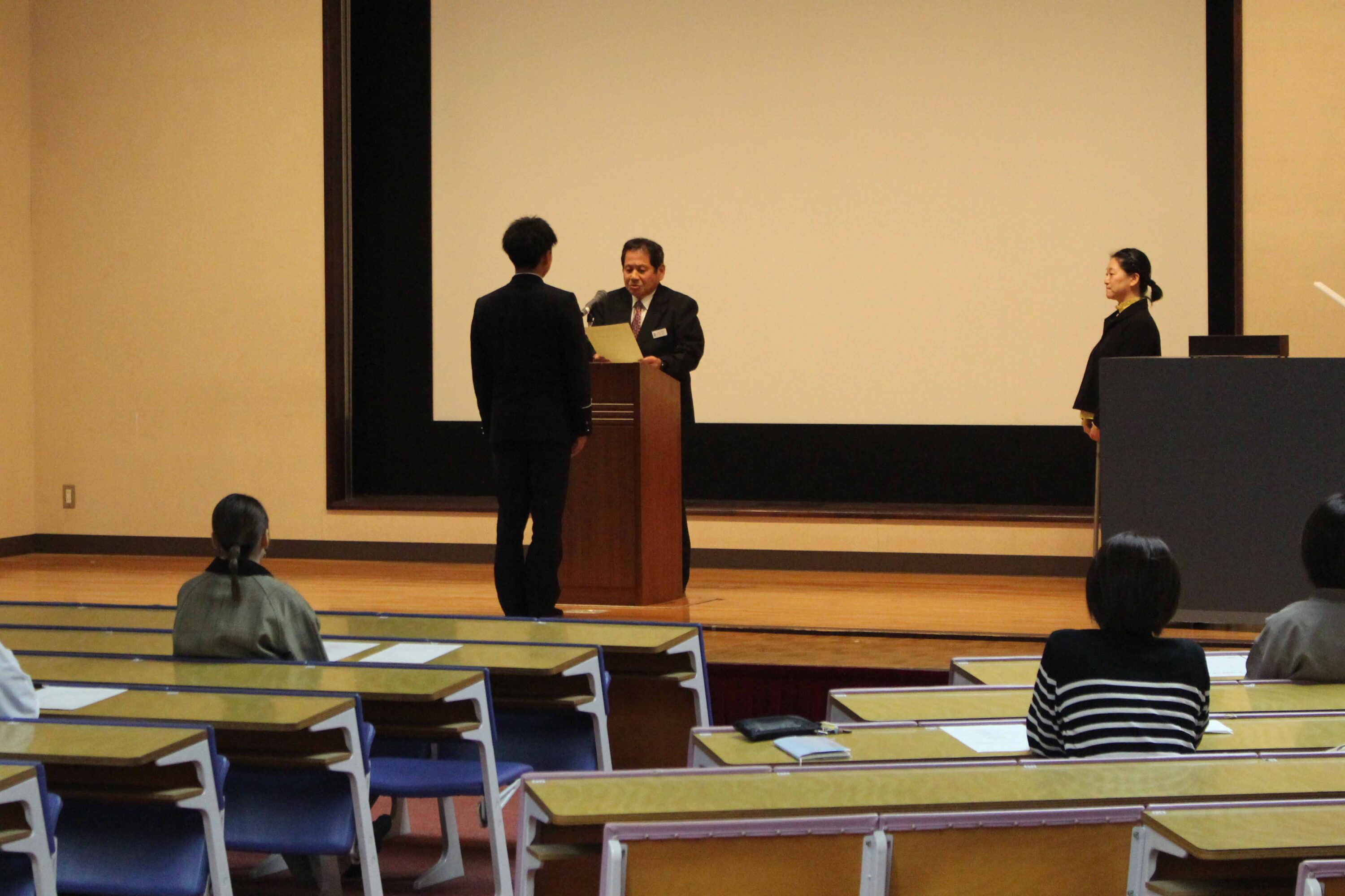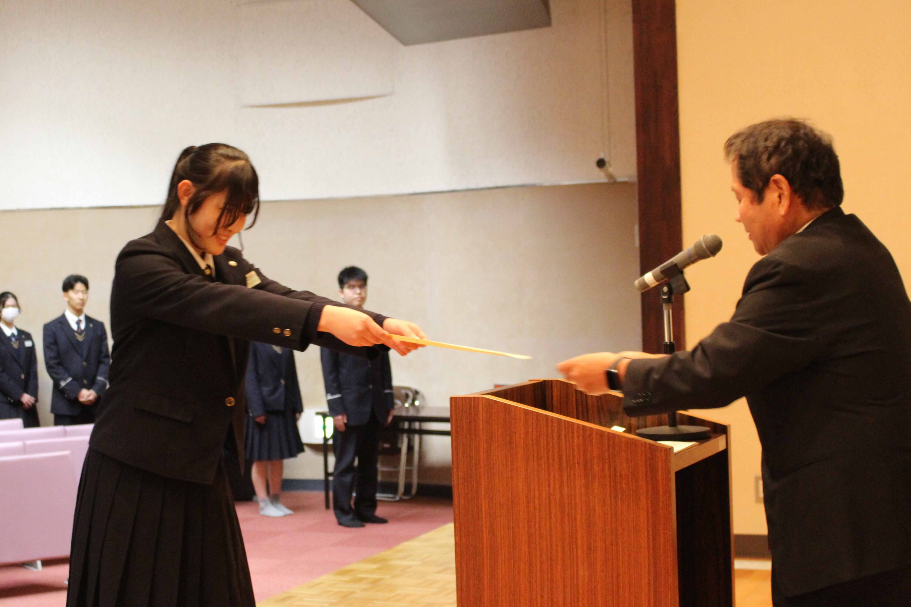 11月12日(水)、本校レクチャーホールで指定校伝達式が行われました。保護者や職員が見守る中、受験を許可された生徒へ校長から承諾書を授与されました。学校長あいさつの後、生徒を代表して酒井 心春さん(牟田山中出身)が宣誓を行いました。