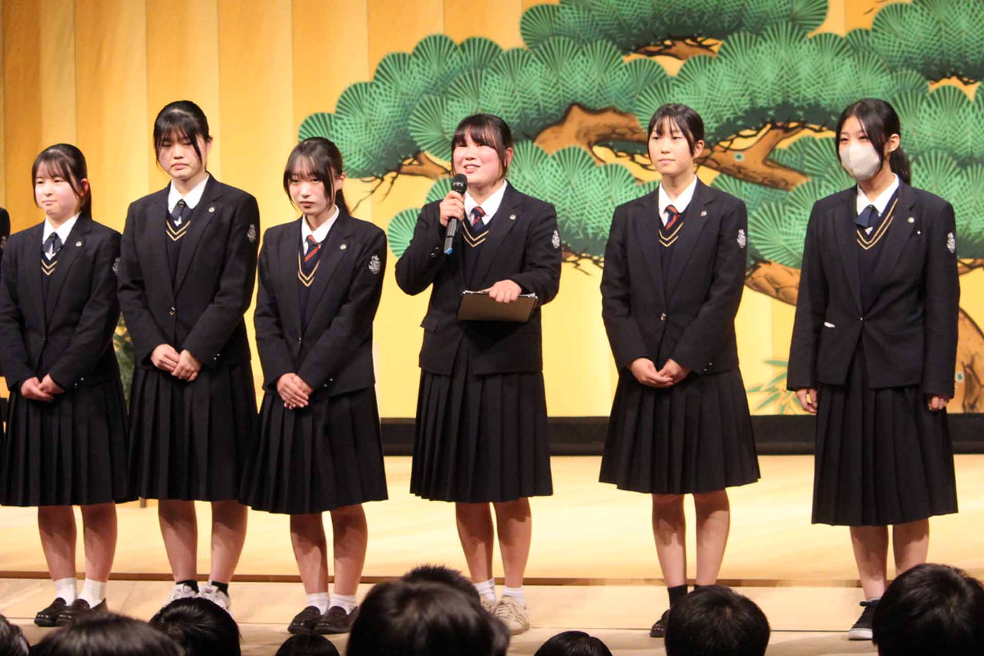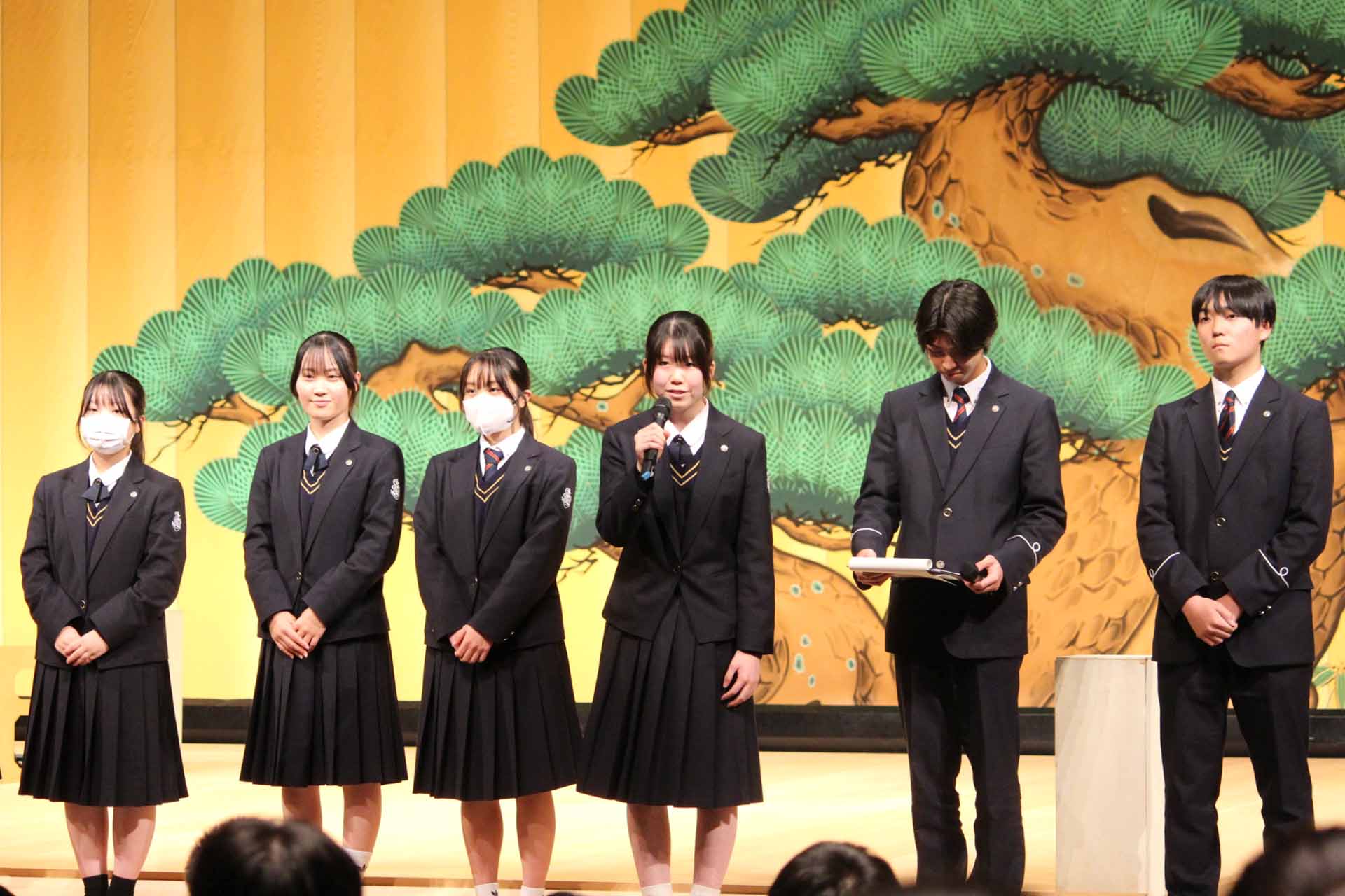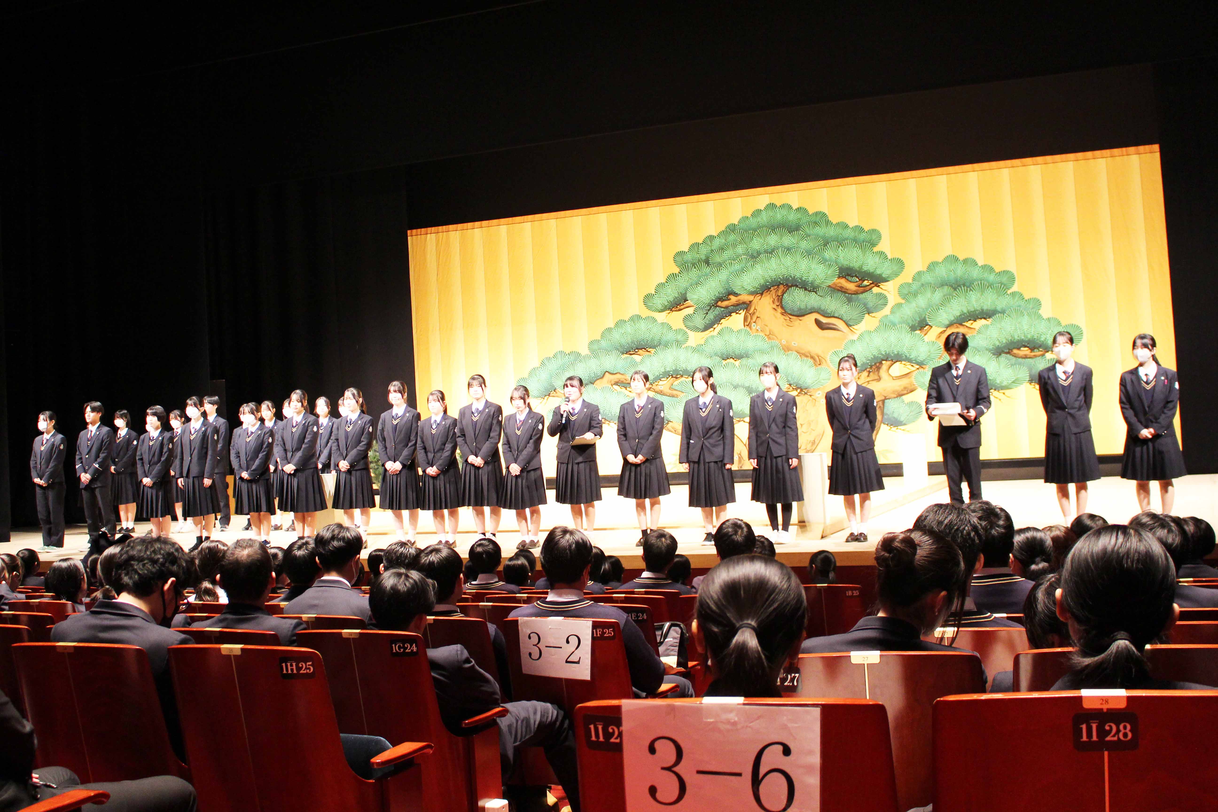 12月23日(火)、芸術鑑賞会終了後に生徒会執行部交代式がありました。旧生徒会長の長尾ひいろさんが最後のあいさつを行い、続いて新執行部の紹介と新生徒会長のあいさつがありました。これから1年間、新生徒会執行部を全校生徒で盛り上げていきましょう!
