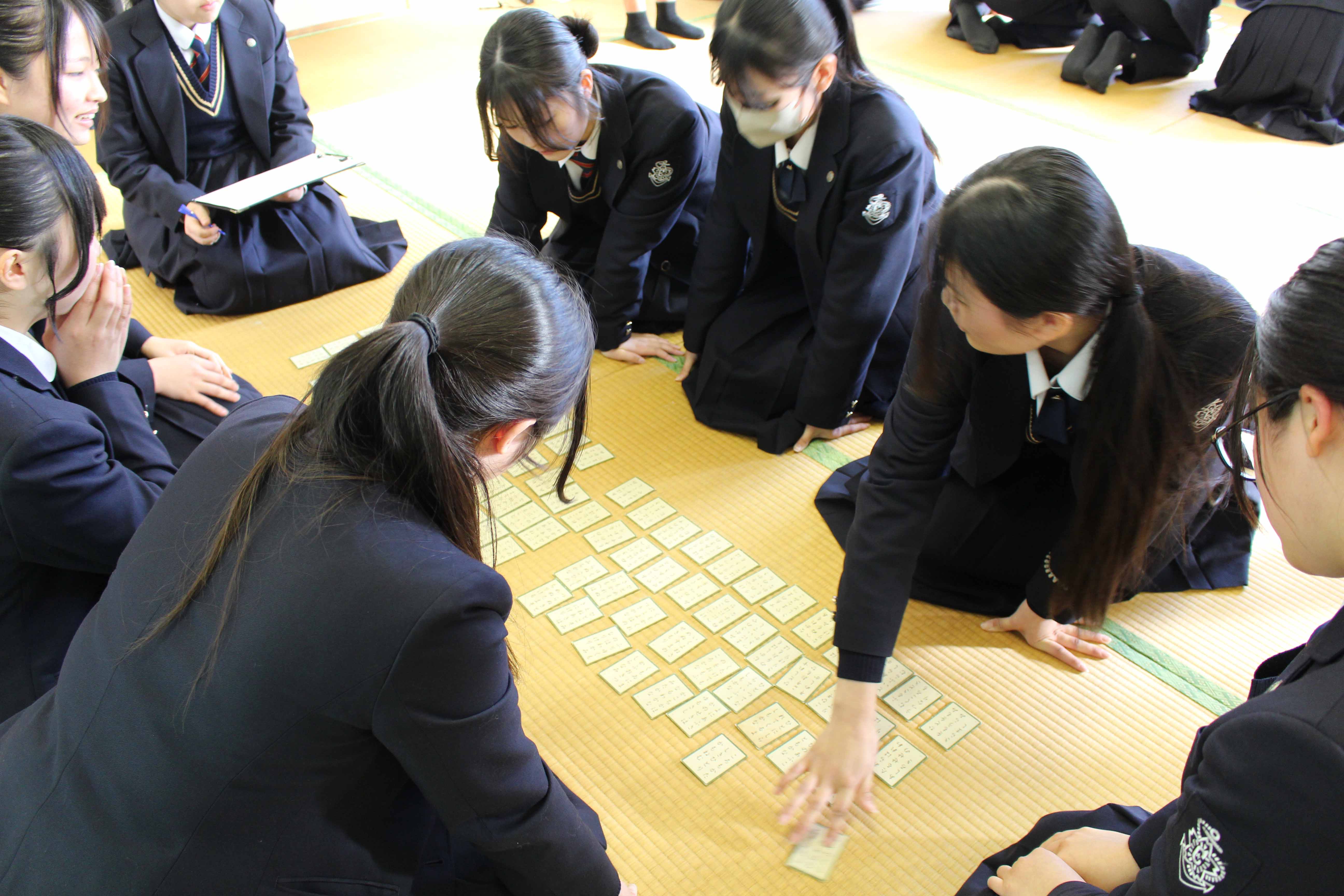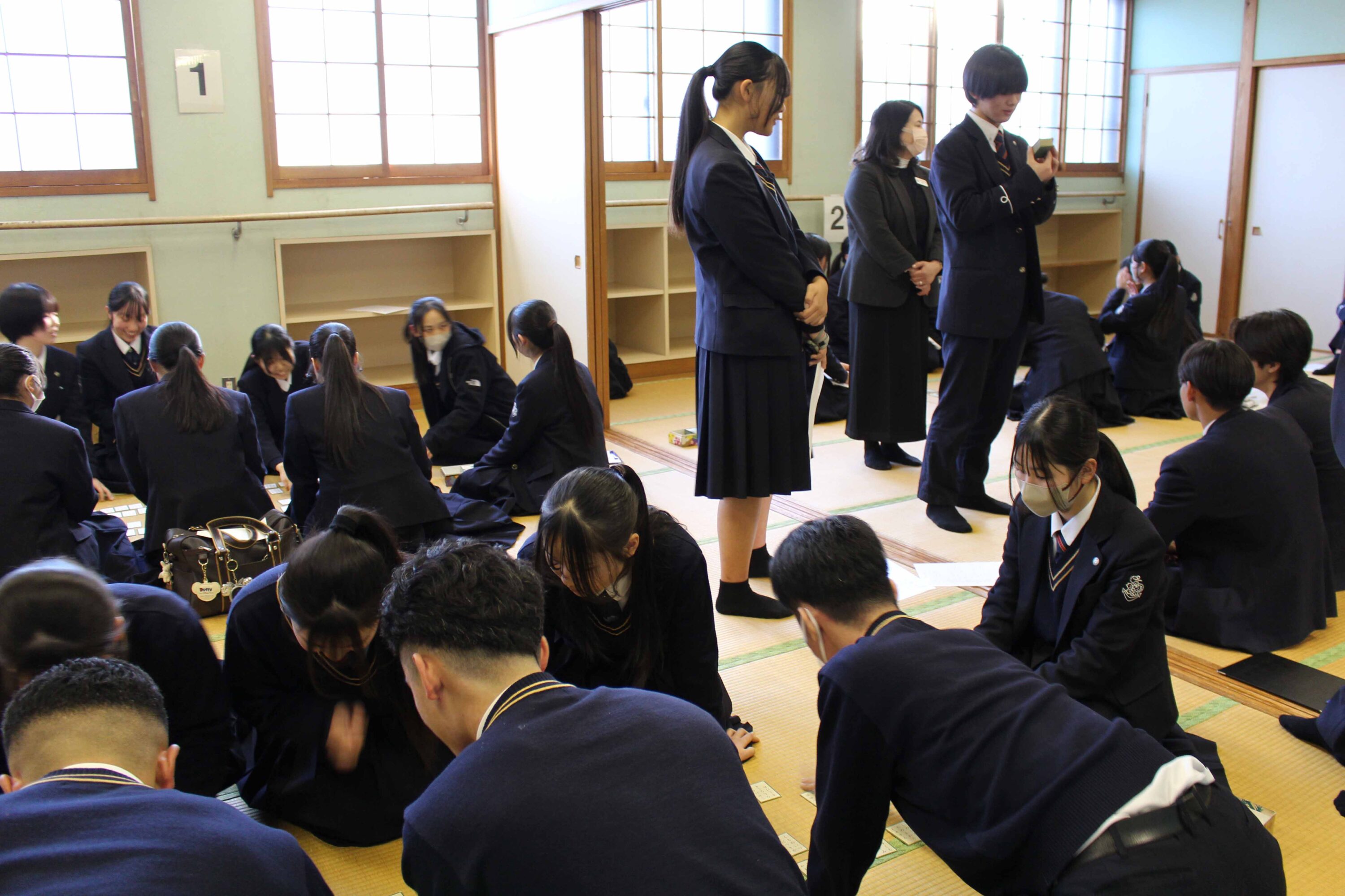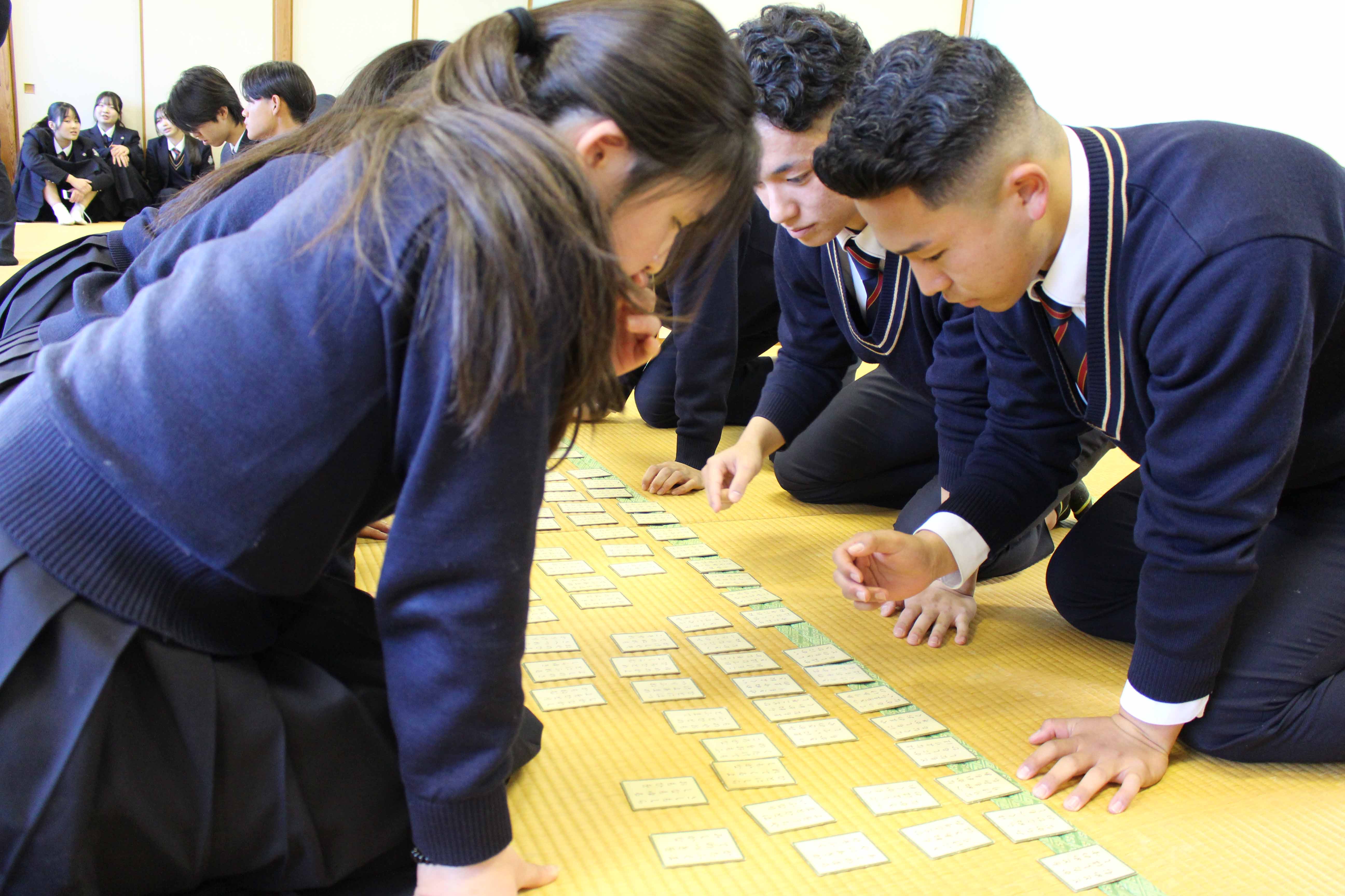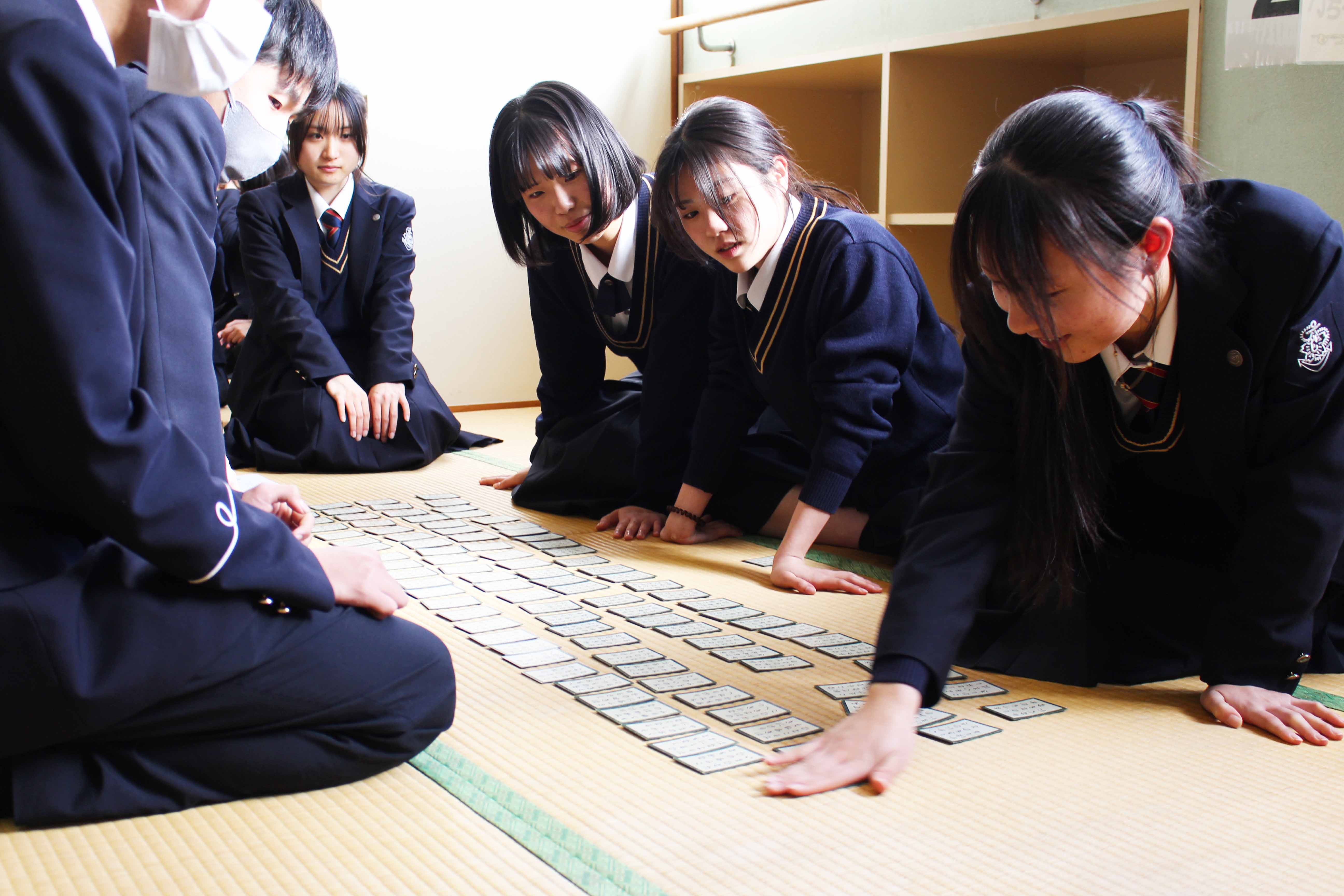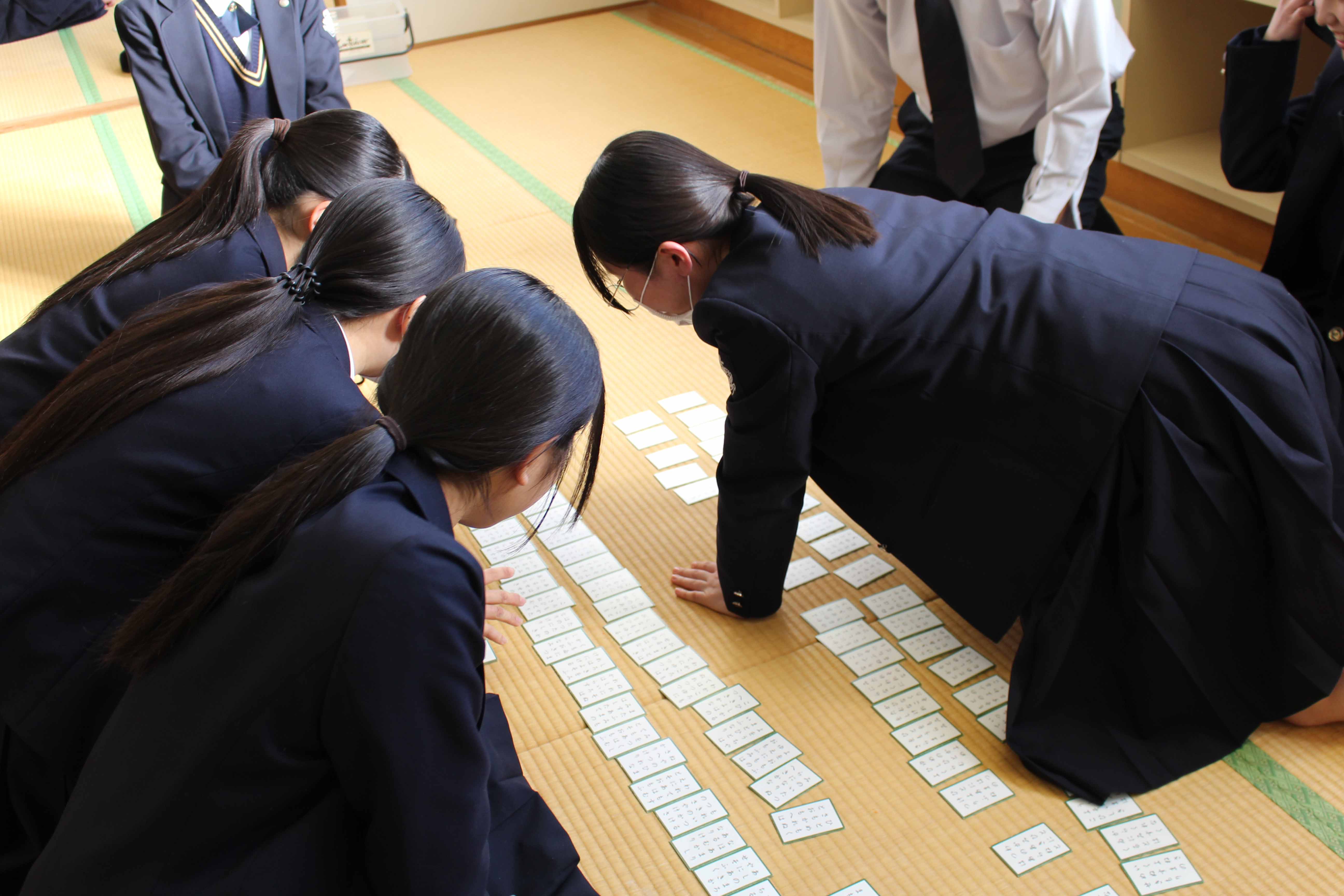 競技かるたは明治37年に東京で全国大会を開催したことに始まるとされていて、その競技は、武道にも通じるものがあり、集中力・忍耐力・精神力を尽くして臨む真剣勝負は、まさに「畳の上の格闘技」といわれています。本校では、昭和56年1月30日に第1回かるた会が開催され、そこから長い年月を重ねて今年で47回目を数えます。これは、本校の大切な伝統の一つと言えます。今日は、小倉百人一首が歌われた時代の人々の想いや情景に心を寄せながら1枚でも多くの札を取ることを目標に最後まで全力で取り組んでください。