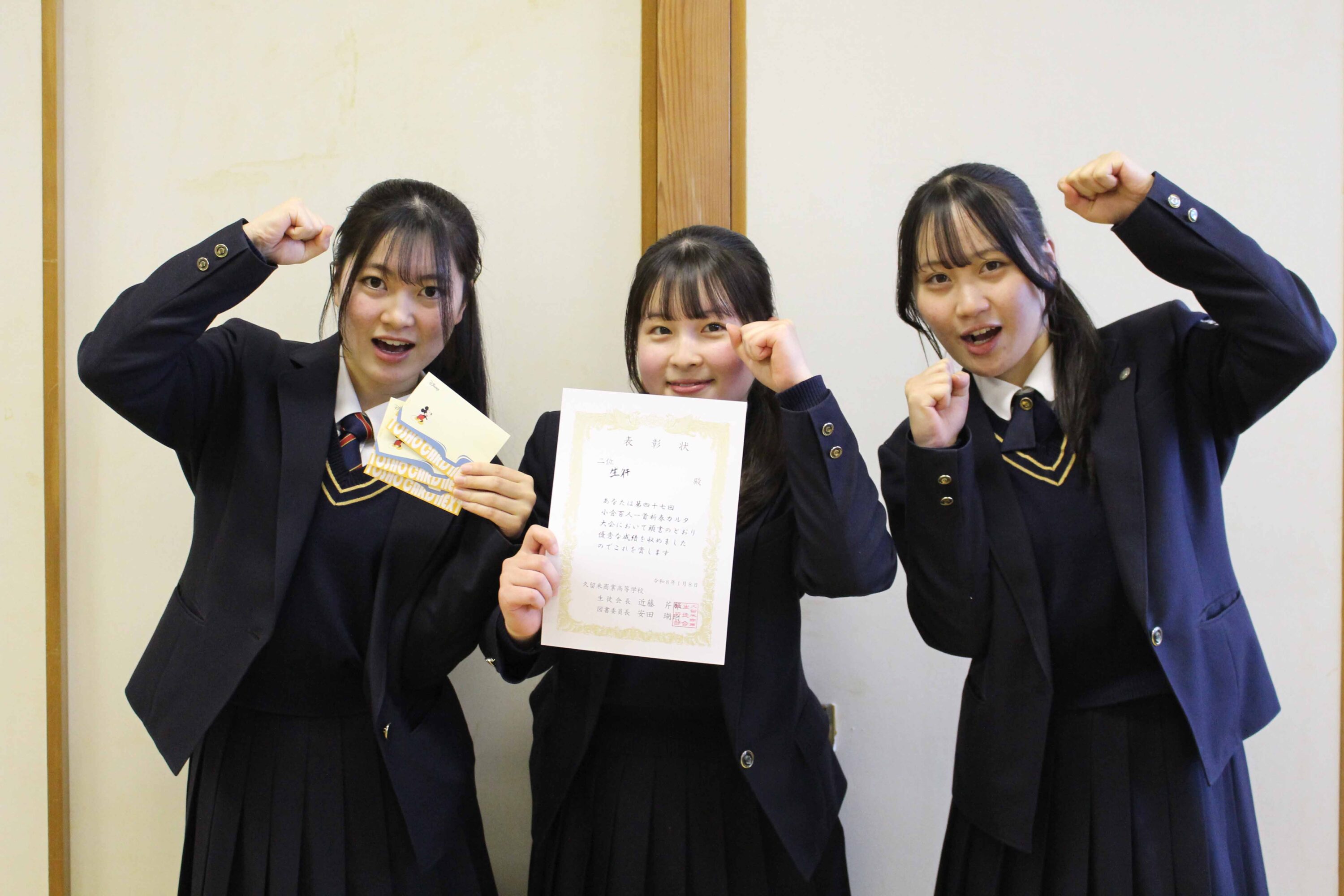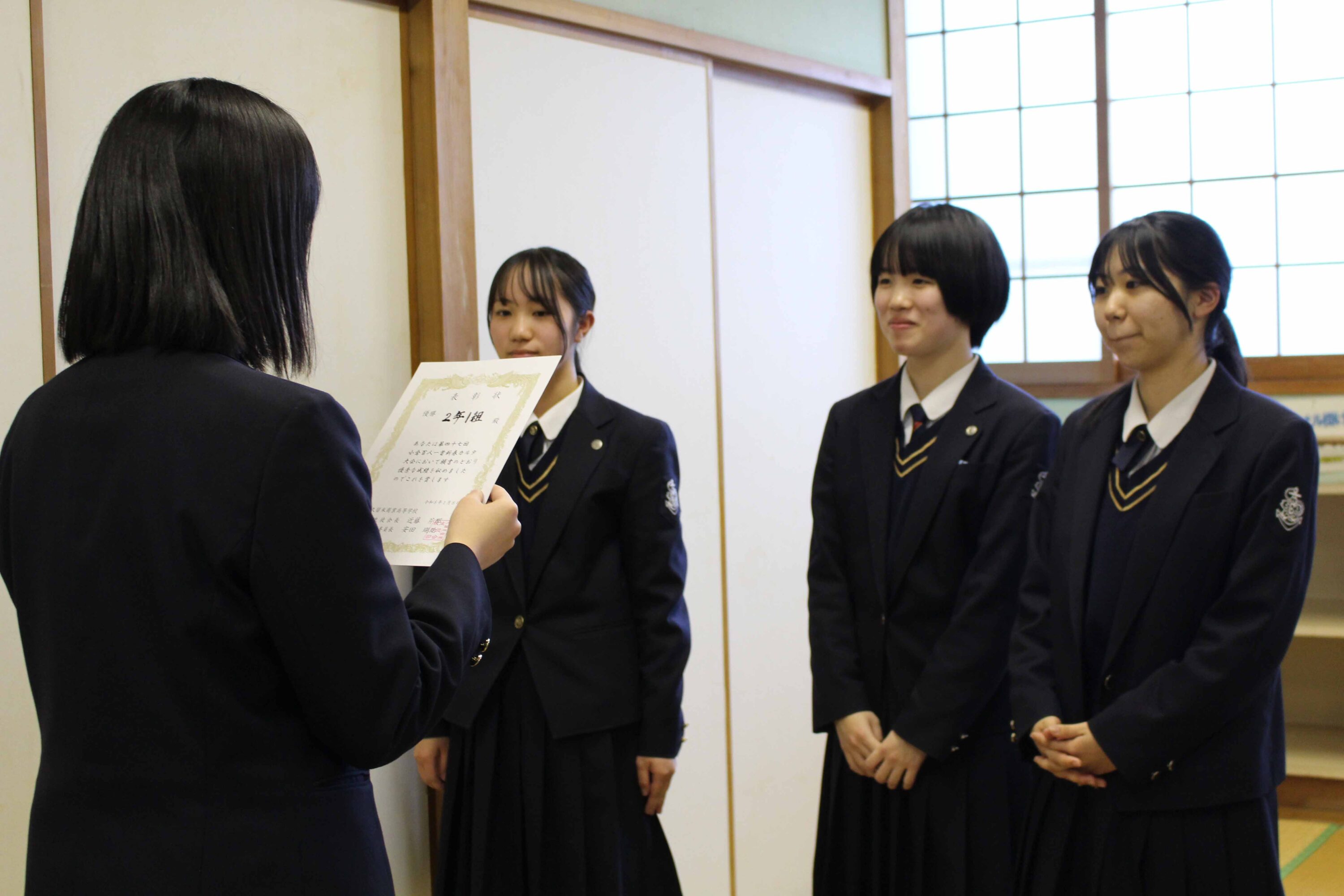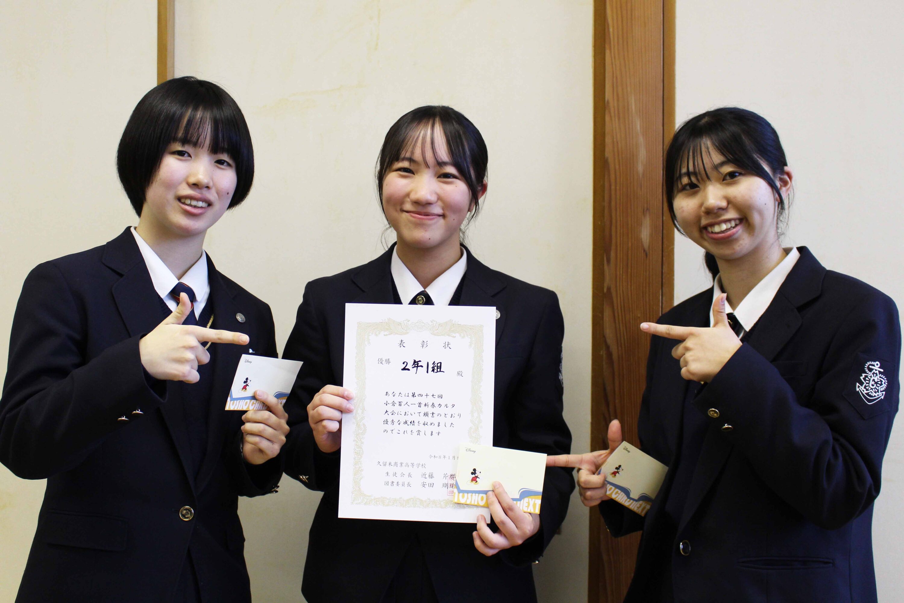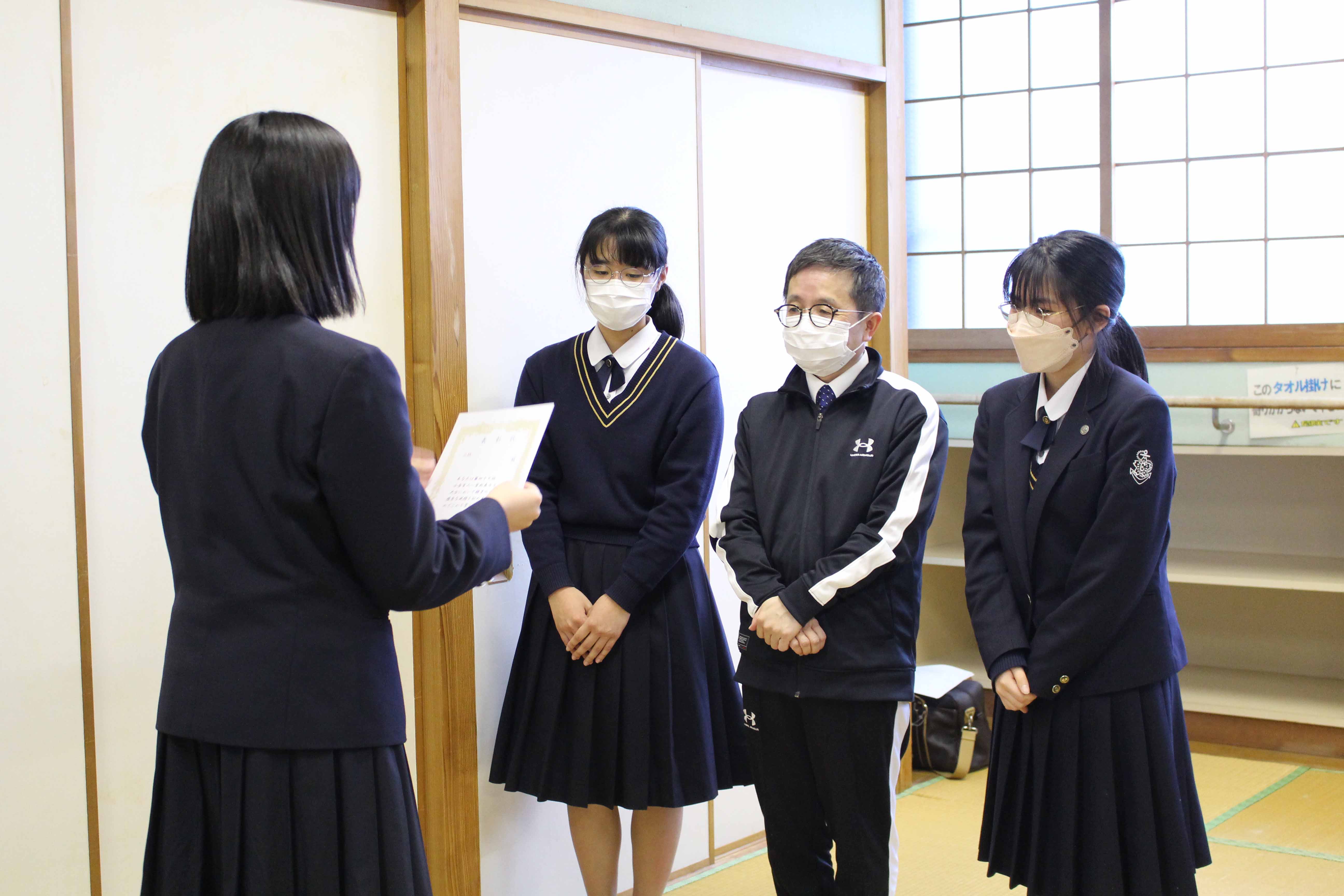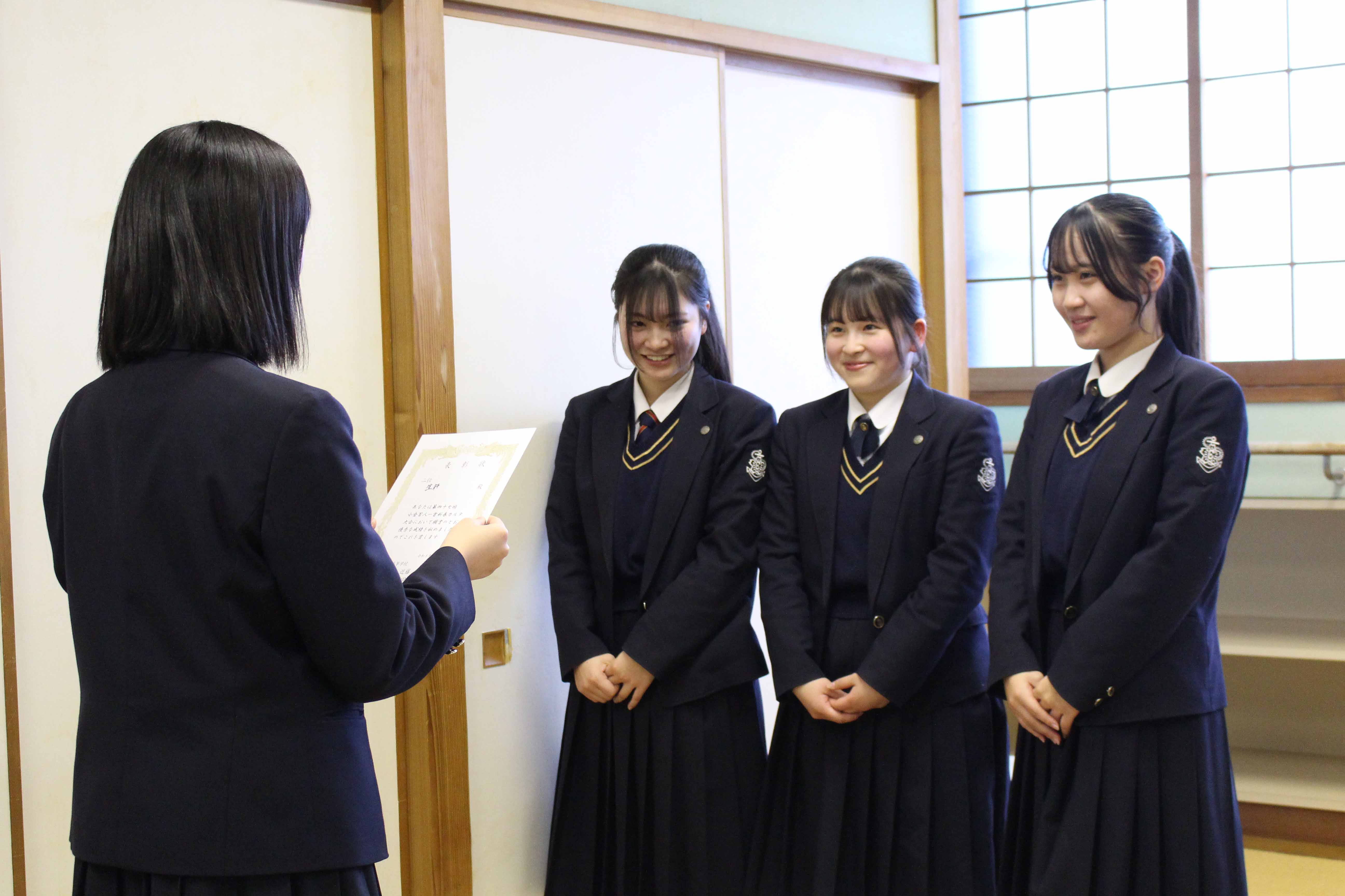 優 勝 「2年1組」 中村 桃子(2年・諏訪中)、下川 千奈(2年・筑後中)、松枝 真愛(2年・諏訪中)