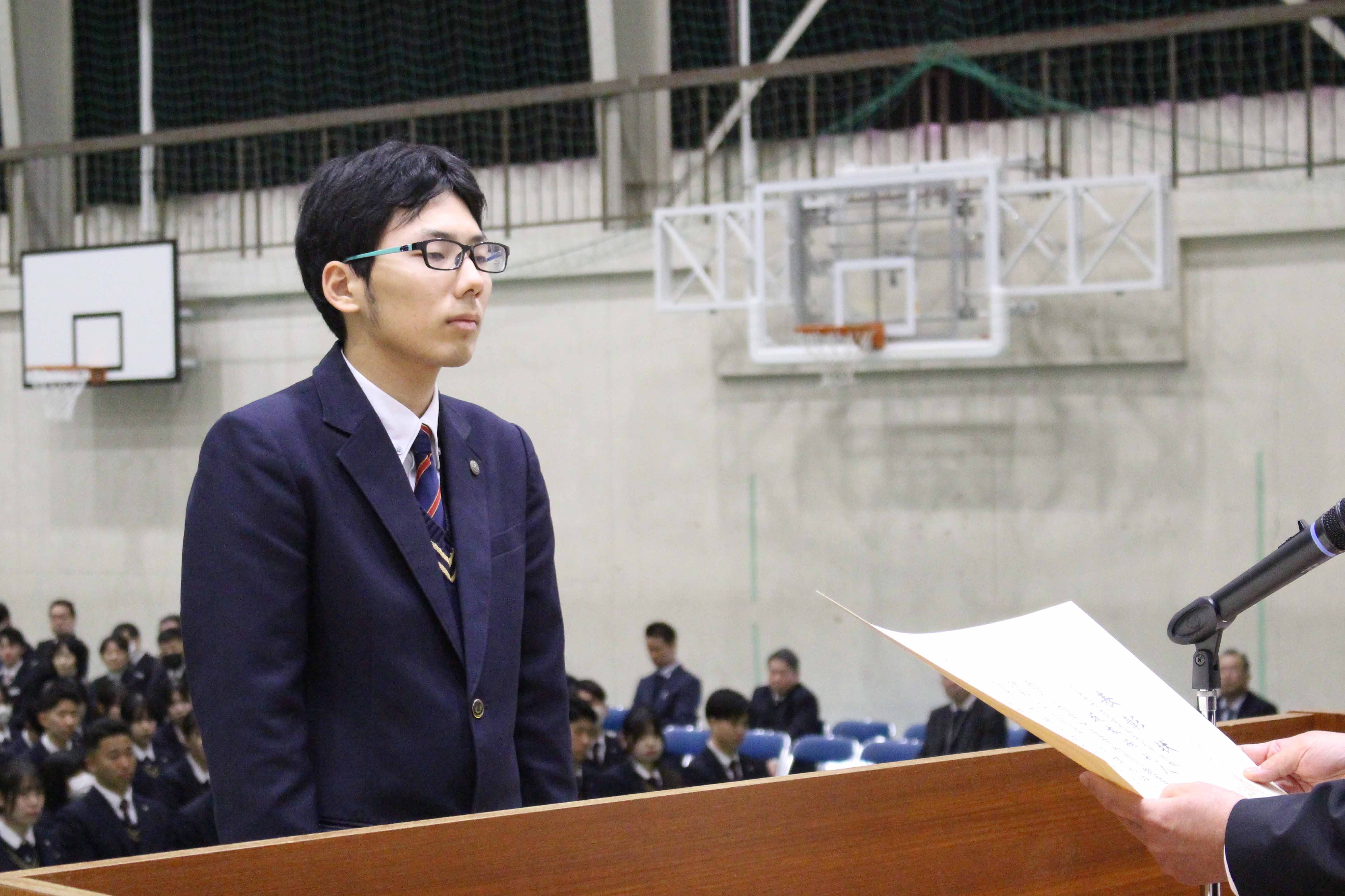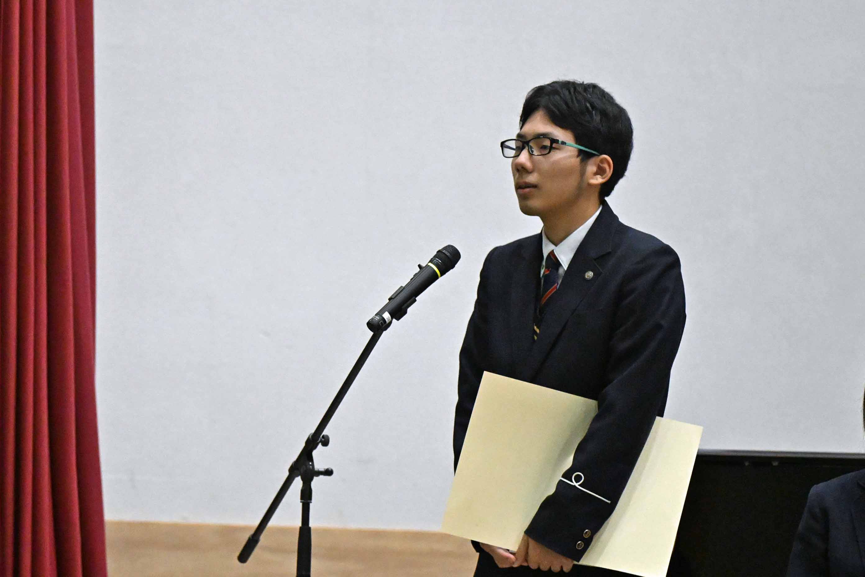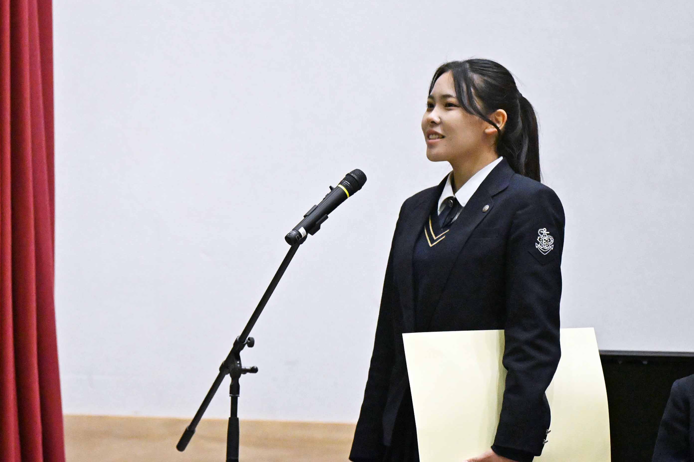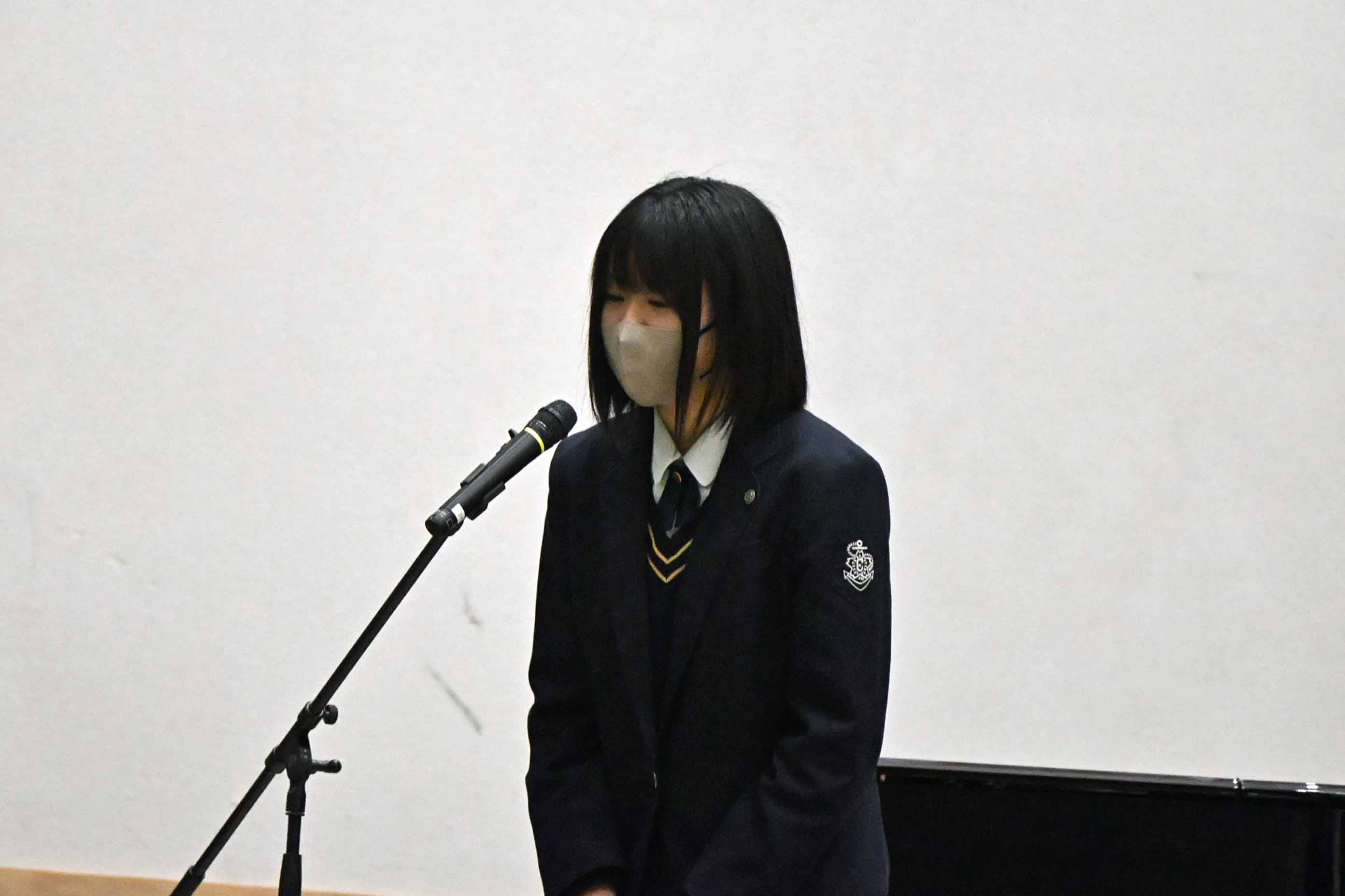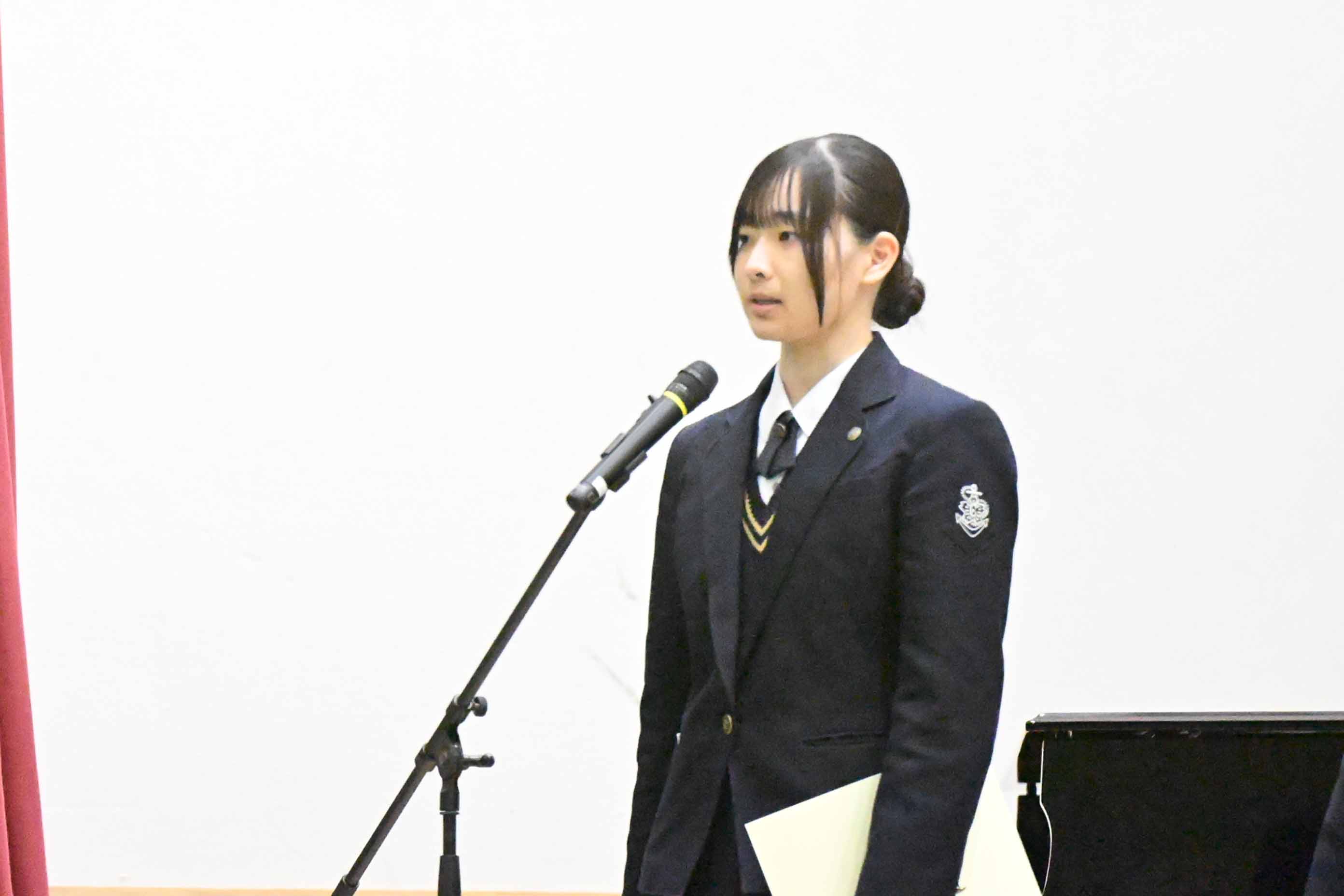 今回はこのような賞をいただき大変光栄に思います。小さな努力を毎日積み重ねることが大切だと、改めて実感することができました。私は検定や部活動を頑張る中で、知識だけではなく自信を身につけることができました。これからの生活では、ただ与えられた課題に取り組むのではなく主体的に学び、身につけた自信を新しいことへの挑戦に繋げたいと思っています。また、今まで努力をできる環境を作ってくださった家族や先生方、友人に心より感謝しています。そのような環境は当たり前に持てるものではないと思うので、これからも余すことなく活用して、感謝し続けていきたいです。1、2年生もこれから学校という努力できる環境を最大限に活用して頑張ってください。