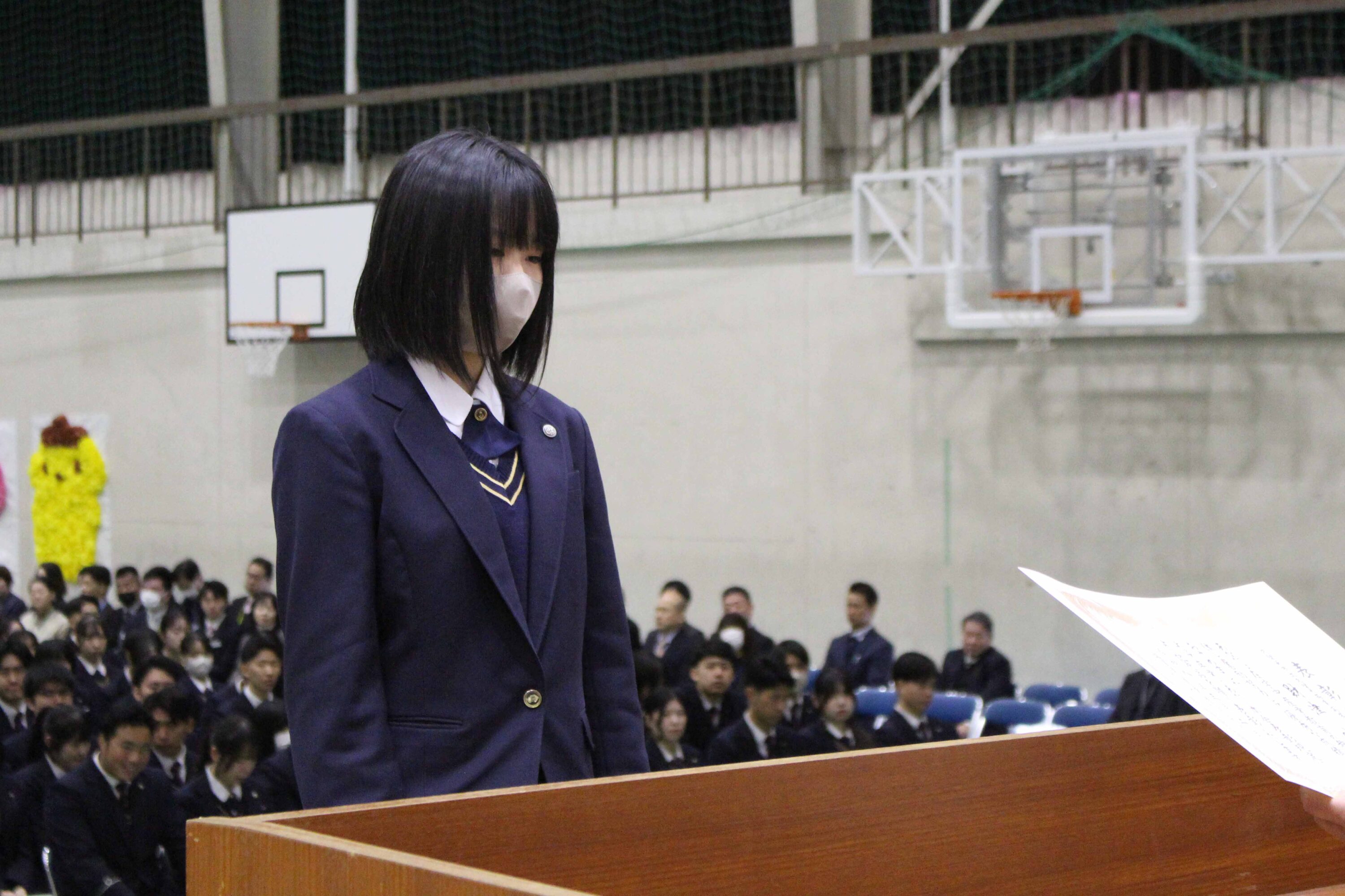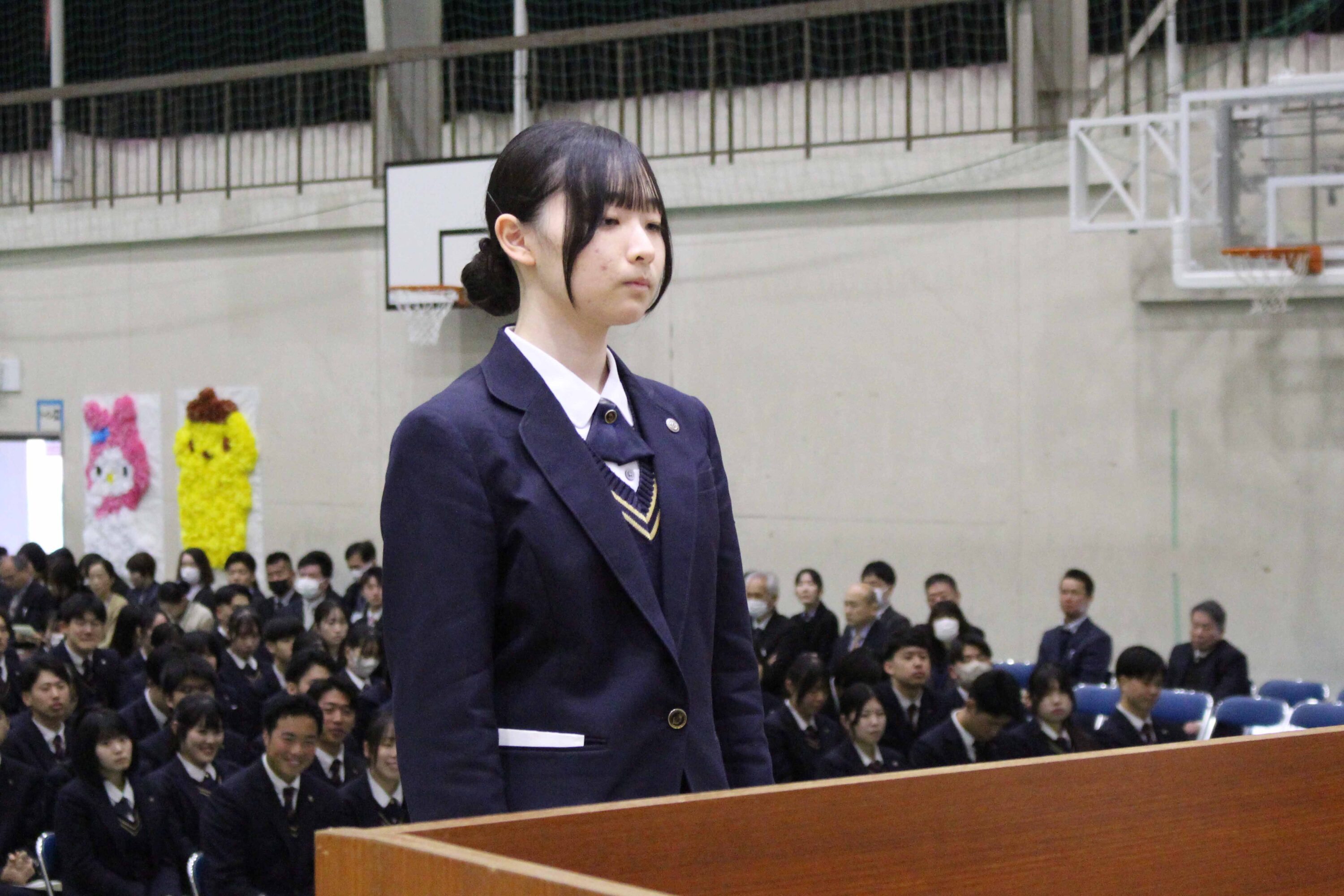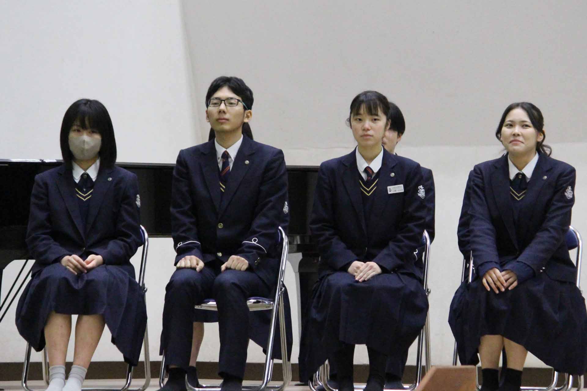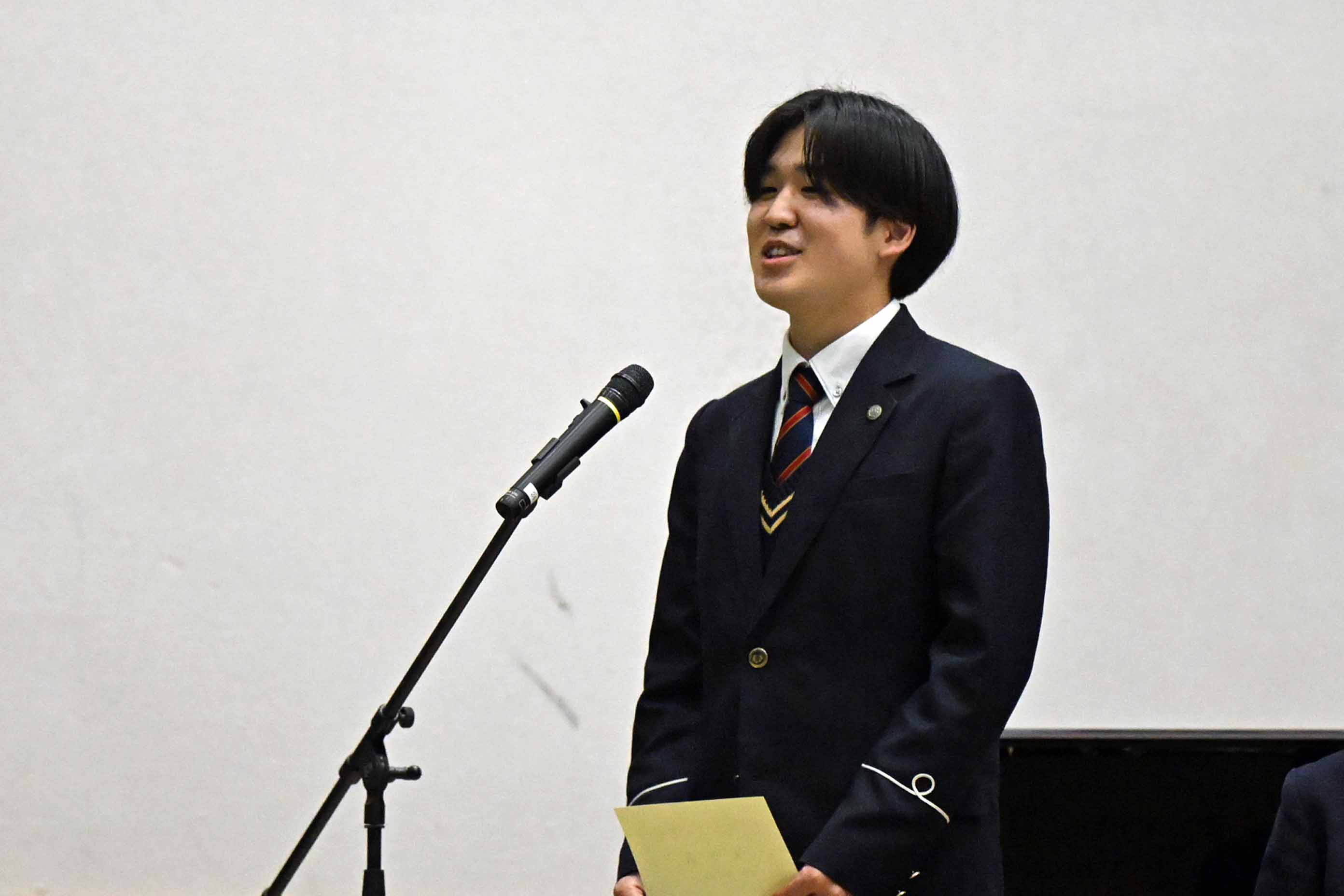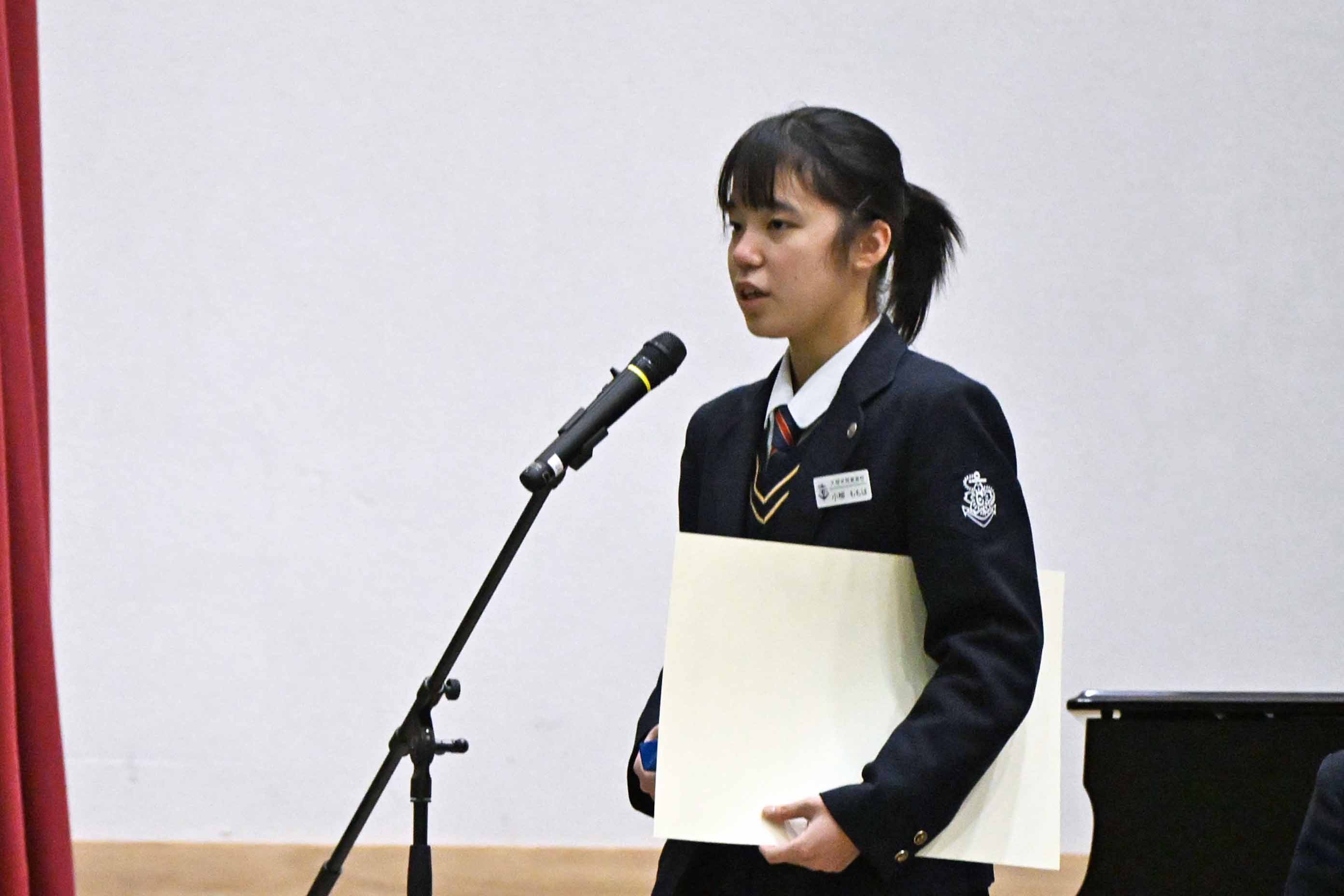 今回はこのような賞をいただき大変光栄に思います。小さな努力を毎日積み重ねることが大切だと、改めて実感することができました。私は検定や部活動を頑張る中で、知識だけではなく自信を身につけることができました。これからの生活では、ただ与えられた課題に取り組むのではなく主体的に学び、身につけた自信を新しいことへの挑戦に繋げたいと思っています。また、今まで努力をできる環境を作ってくださった家族や先生方、友人に心より感謝しています。そのような環境は当たり前に持てるものではないと思うので、これからも余すことなく活用して、感謝し続けていきたいです。1、2年生もこれから学校という努力できる環境を最大限に活用して頑張ってください。