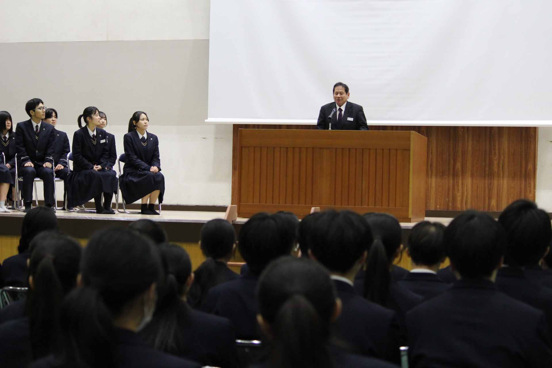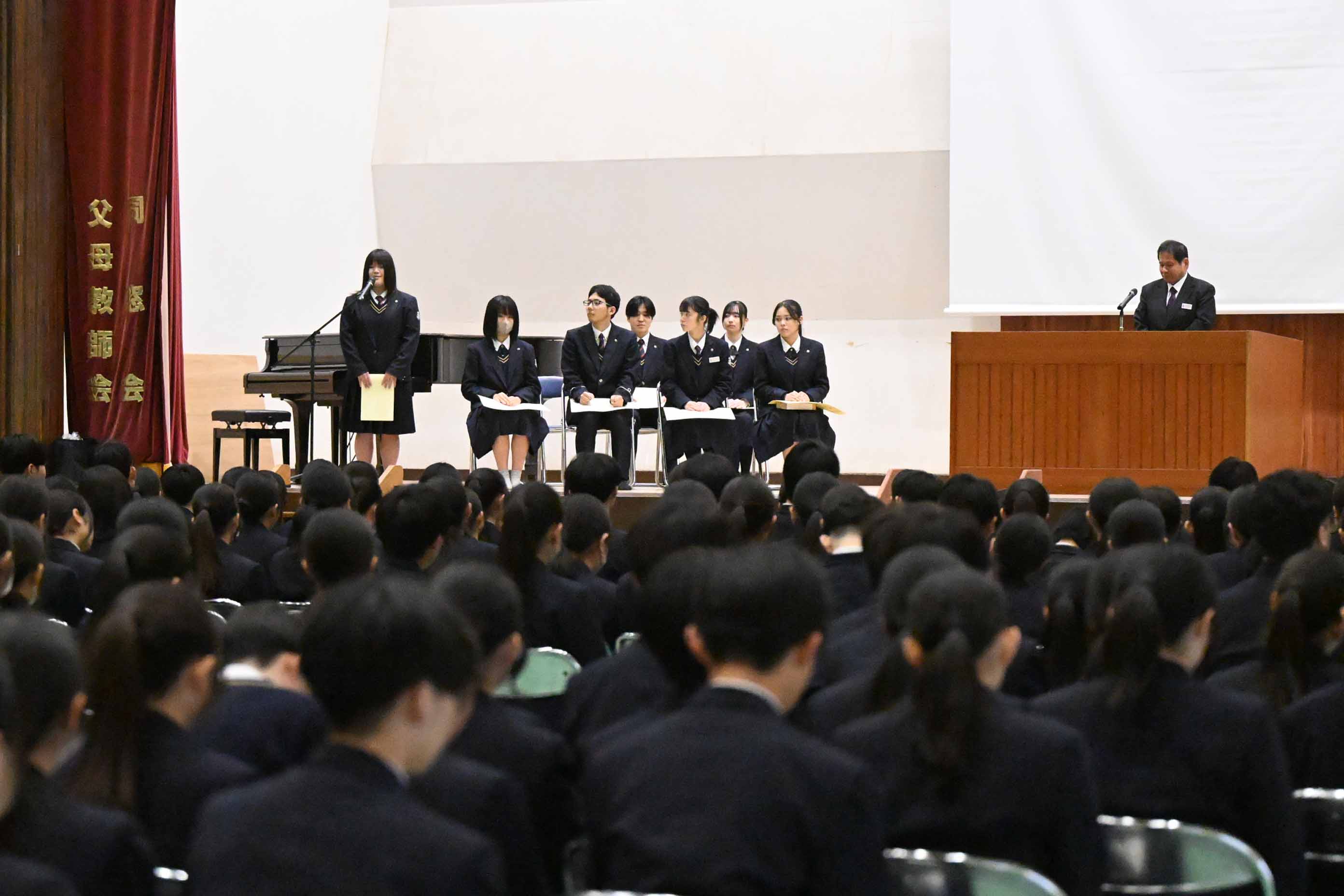 3学年全員が揃うのは今日が最後です。その最後の日に日々の勉強はもちろん、検定や資格の取得、部活動での活躍などで頑張った人たちを表彰します。この1年間、あるいは3年間で一生懸命努力をしてきた人たちの証となるものです。3年生はこれから先の糧として受け止め、また1,2年生はこれからも自分の得意分野を磨いて表彰されるよう文武両道で頑張ってください。