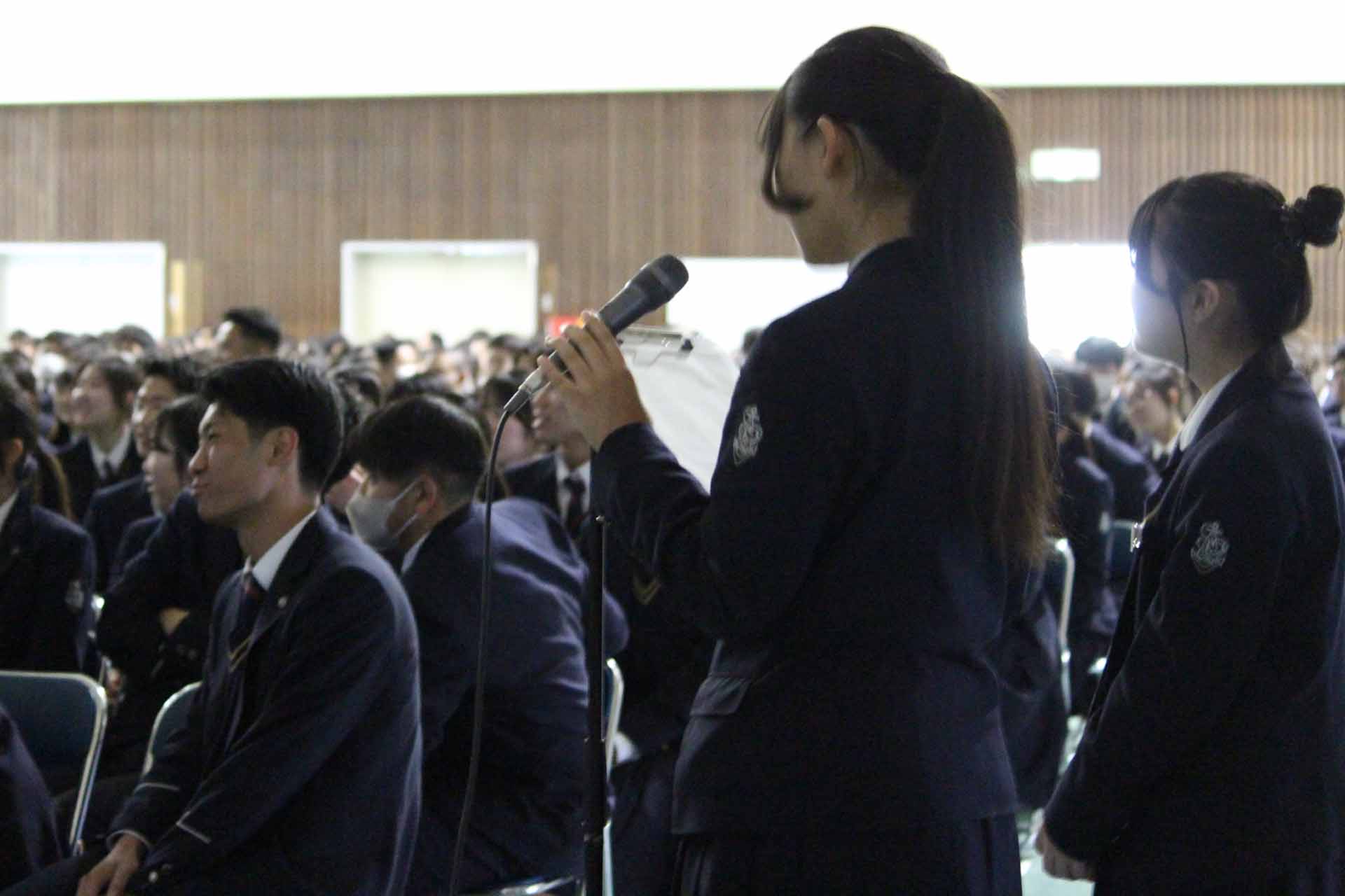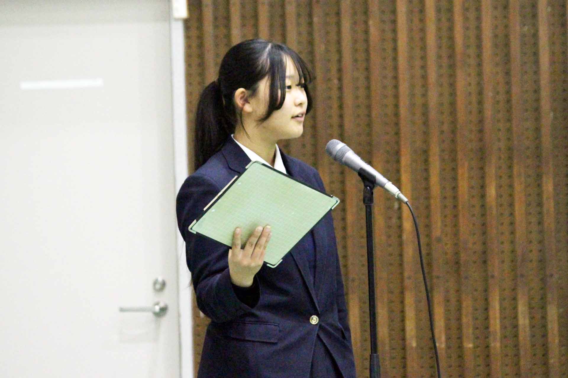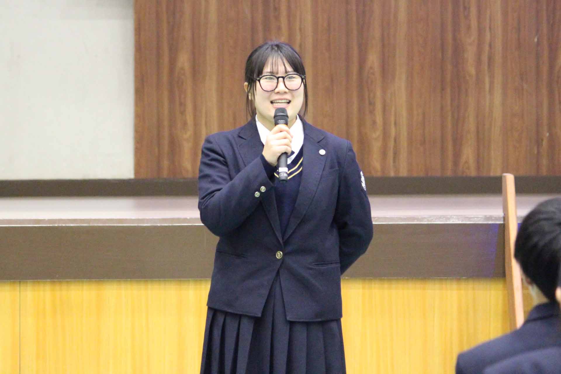 今日は私たちのためにこのような会を開いていただきありがとうございました。3年生になって皆さんが作ってくれたビデオを見ると、いろいろな思い出がよみがえり懐かしい気持ちになりました。楽しい3年間を過ごせたのも皆さんや先生方のおかげだと感謝しています。私は久商に入って自分の夢を実現することができました。皆さんも悔いのないよう自分の夢に向かって、友達や先輩、先生方との絆を大切に頑張っていってください。今日は本当にありがとうございました。