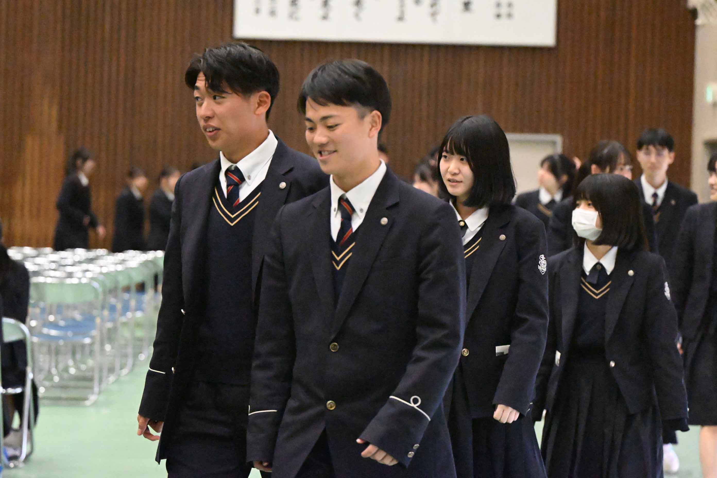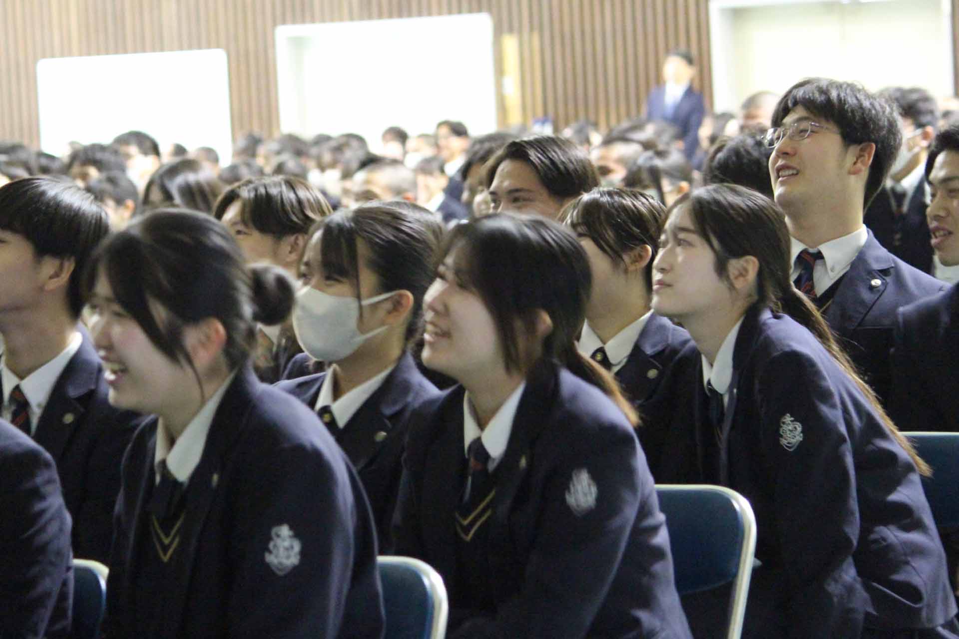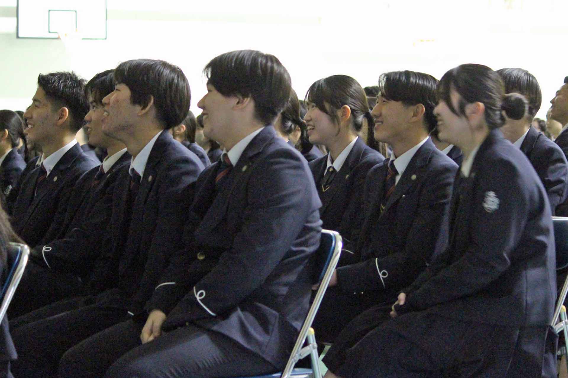 今日は私たちのためにこのような会を開いていただきありがとうございました。3年生になって皆さんが作ってくれたビデオを見ると、いろいろな思い出がよみがえり懐かしい気持ちになりました。楽しい3年間を過ごせたのも皆さんや先生方のおかげだと感謝しています。私は久商に入って自分の夢を実現することができました。皆さんも悔いのないよう自分の夢に向かって、友達や先輩、先生方との絆を大切に頑張っていってください。今日は本当にありがとうございました。