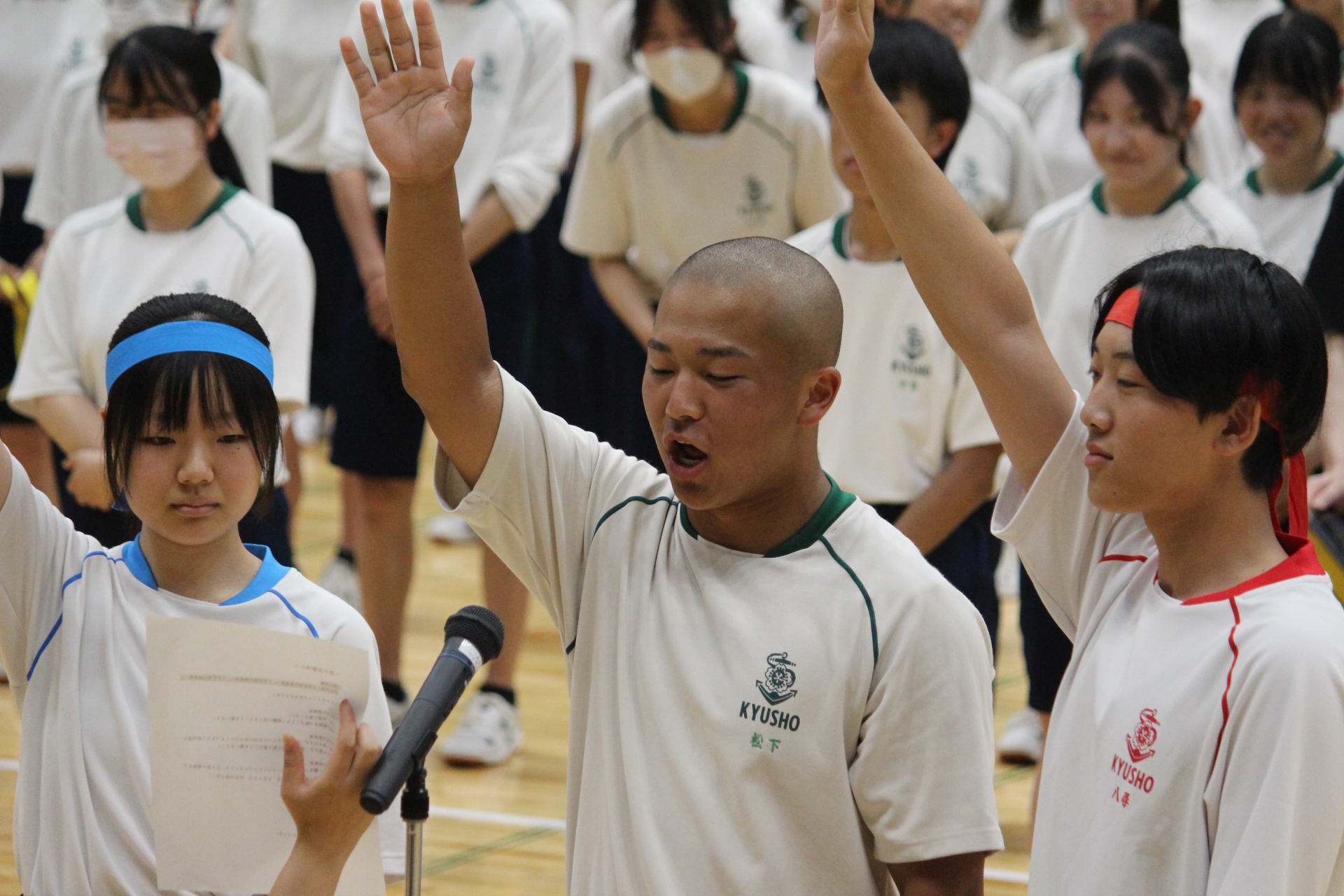 6月30日(月)、久留米アリーナでスポーツフェスティバルが行われました。学年ごとに赤(1年)・青(2年)・黄(3年)の3ブロックにわかれ、熱のこもった競技や応援が繰り広げられました。1.開会式 開会宣言 久保田 一愛 …
